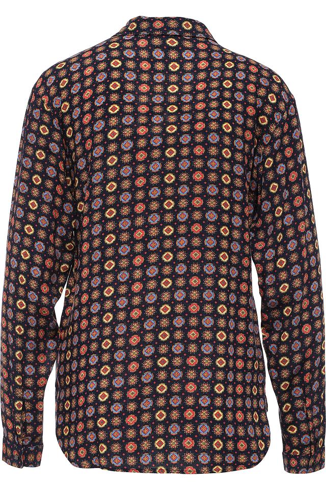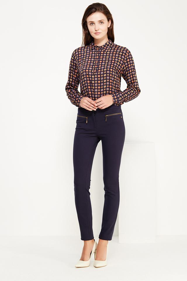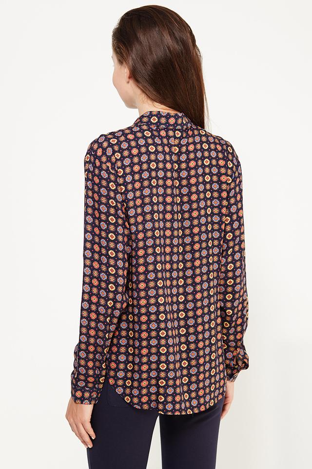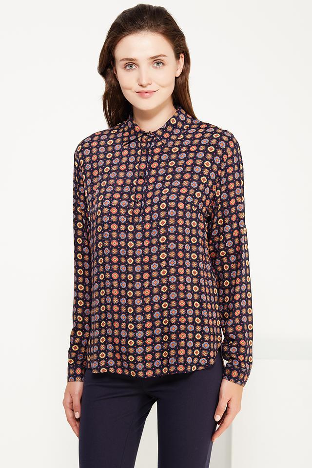 Основной цвет блузы – темно-синий, а яркий принт с цветами в красных, желтых и голубых тонах делает ее уникальной и привлекательной.