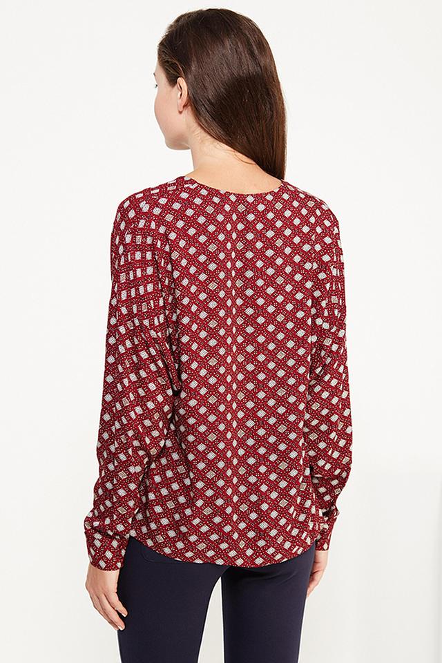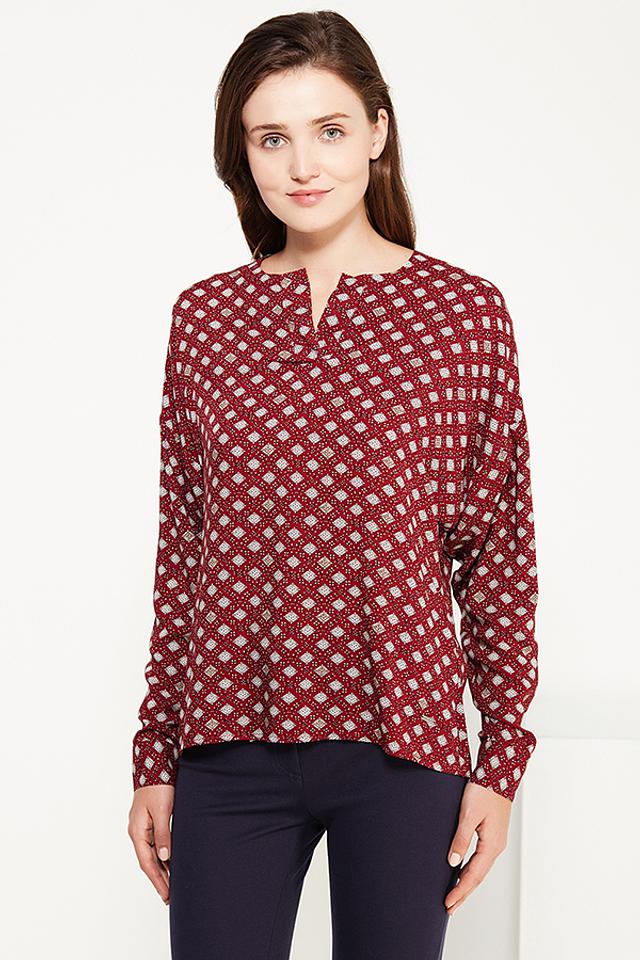 Блуза имеет бордовый цвет с оригинальным геометрическим принтом в клетку, который придает ей изысканность и неповторимость. V-образный вырез горловины и длинные рукава делают ее подходящей для создания как повседневных, так и более элегантных образов.