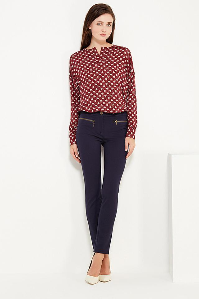 Блуза от FINN FLARE бордового цвета с геометрическим принтом. Изготовлена из мягкой вискозы, имеет длинные рукава и V-образный вырез горловины. Состав: вискоза 100%