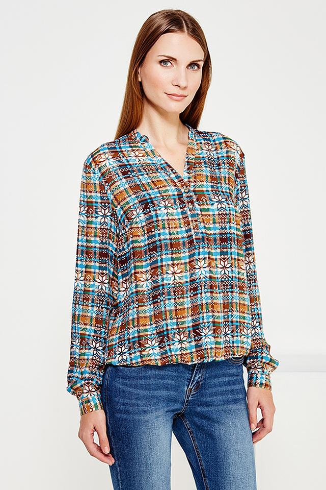 Блуза имеет оригинальный принт в коричнево-голубой гамме, который придает ей неповторимый вид. V-образный вырез подчеркивает женственность, а рукава 3/4 делают ее универсальной для любого времени года.