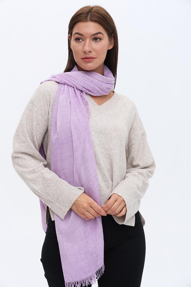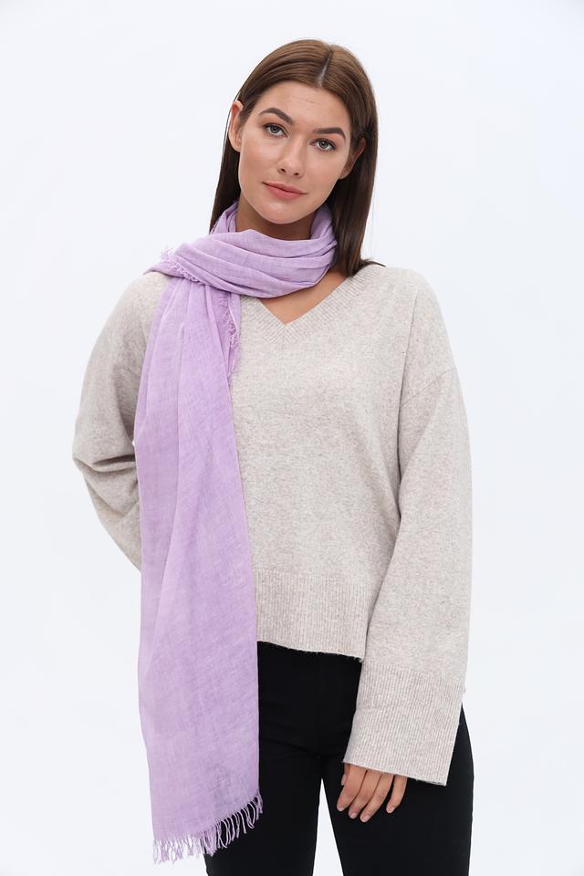 Шарф имеет прямоугольную форму и украшен легкой бахромой по краям, что придает ему изысканный вид. Его оптимальный размер позволяет носить его различными способами – как вокруг шеи, так и накинутым на плечи.