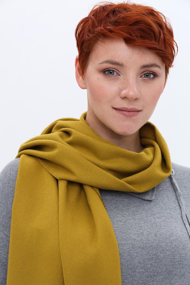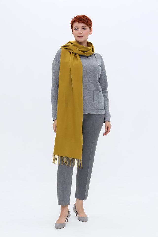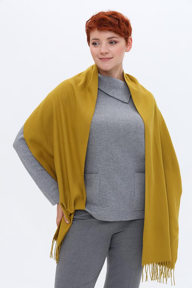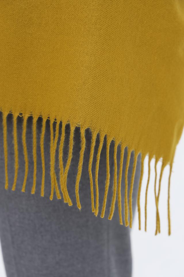 Шарф имеет прямоугольную форму и украшен бахромой по краям, что придает ему изысканный вид. Горчичный цвет делает его ярким акцентом в вашем гардеробе и легко сочетается с различными стилями одежды.