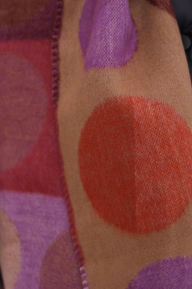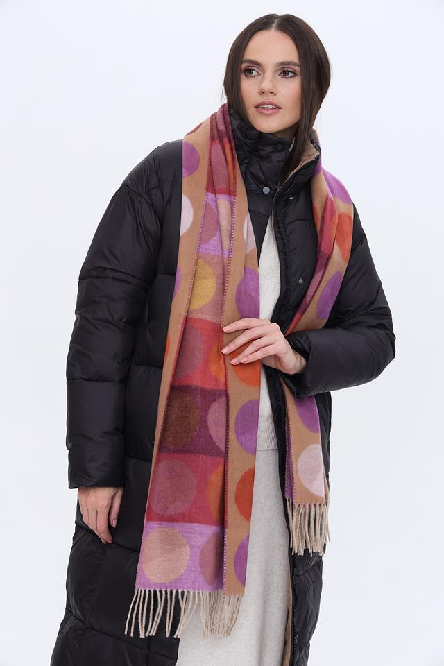 Дизайн шарфа представлен в виде геометрического принта, сочетающего в себе оранжевые, фиолетовые и коричневые оттенки. Круглые элементы разных размеров создают динамичный и современный образ.
