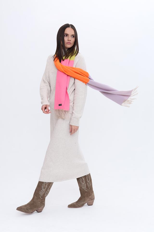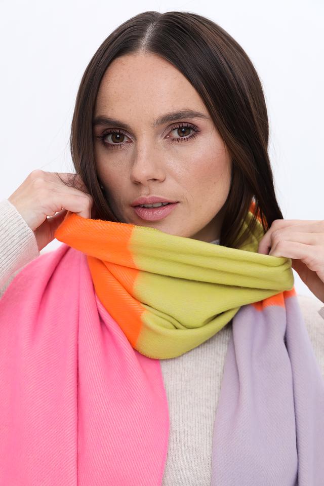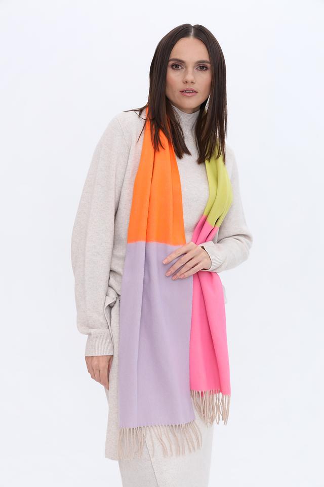 Шарф имеет прямоугольную форму и выполнен в сочетании нескольких цветов: фуксии, оранжевого, лайма и лавандового. Цветовая гамма делает этот аксессуар универсальным и подходящим для различных стилей одежды.