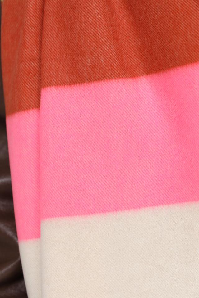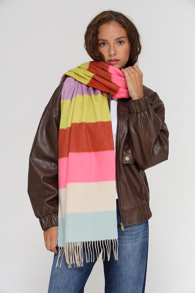 Этот шарф от Fraas станет ярким акцентом в вашем гардеробе. Он выполнен в широкую полоску, сочетающую в себе несколько цветов: розовый, коричневый, зелёный, оранжевый, лиловый и голубой.