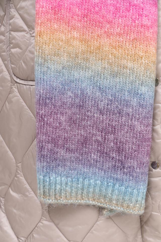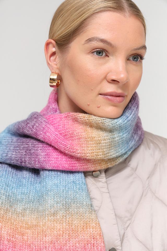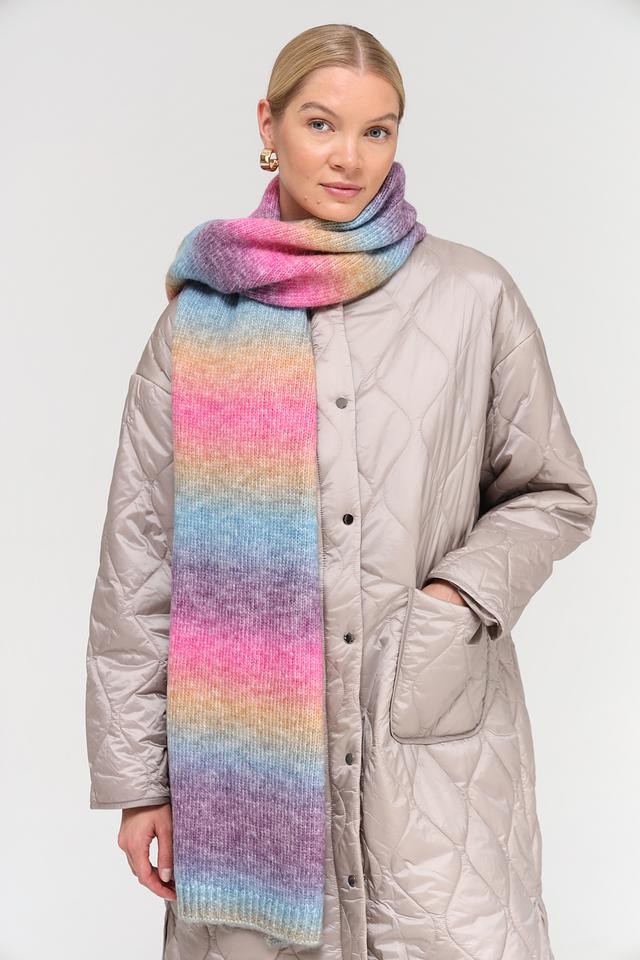 Шарф отличается широкой цветовой гаммой, сочетающей в себе оттенки розового, голубого, фиолетового, желтого и оранжевого. Такое разнообразие цветов позволяет легко сочетать шарф с различными предметами гардероба.