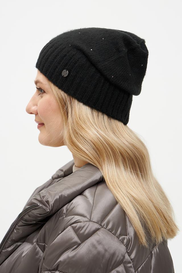 Шапка имеет удобный крой, плотно прилегающий к голове, но не сдавливающий её. Декоративные элементы в виде страз придают шапке изысканность и индивидуальность.