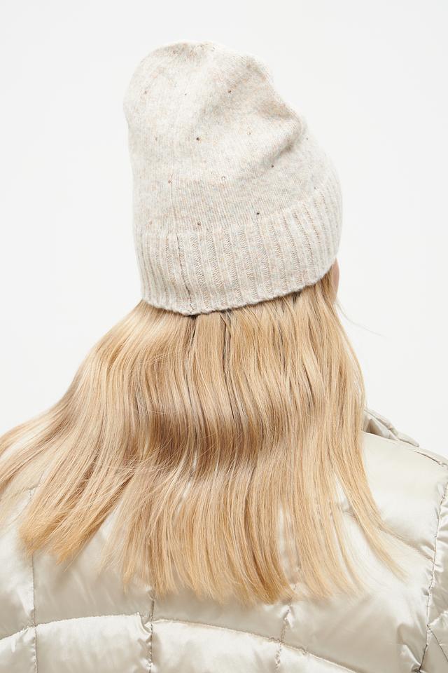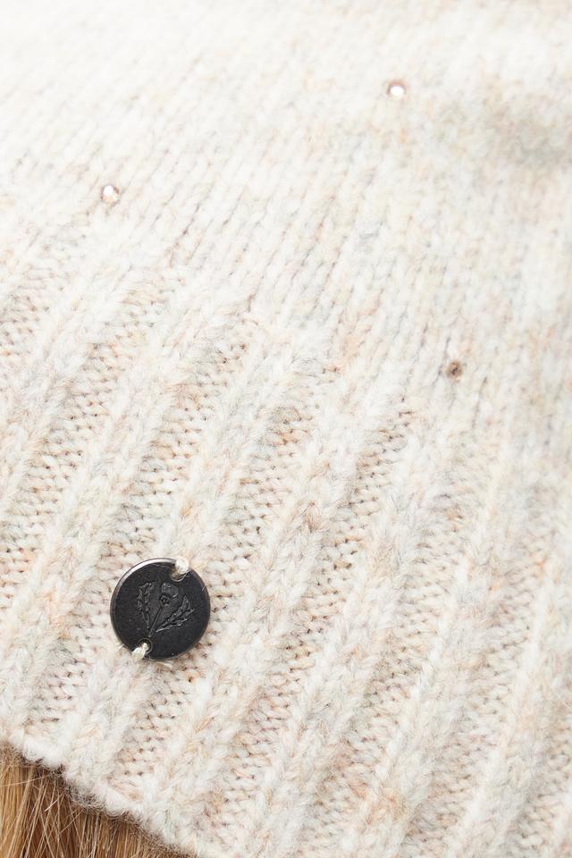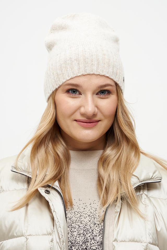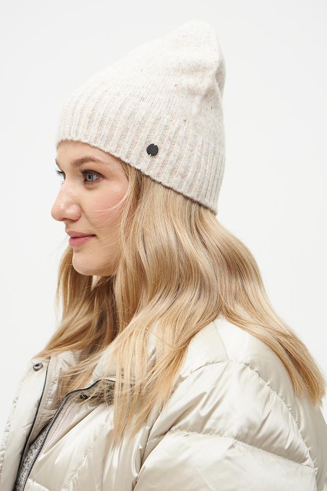 Шапка имеет классический дизайн и нейтральный бежевый цвет, который легко сочетается с любой одеждой. Вязаная текстура придает шапке уютный вид. Небольшой логотип бренда на лицевой стороне добавляет шапке узнаваемости.