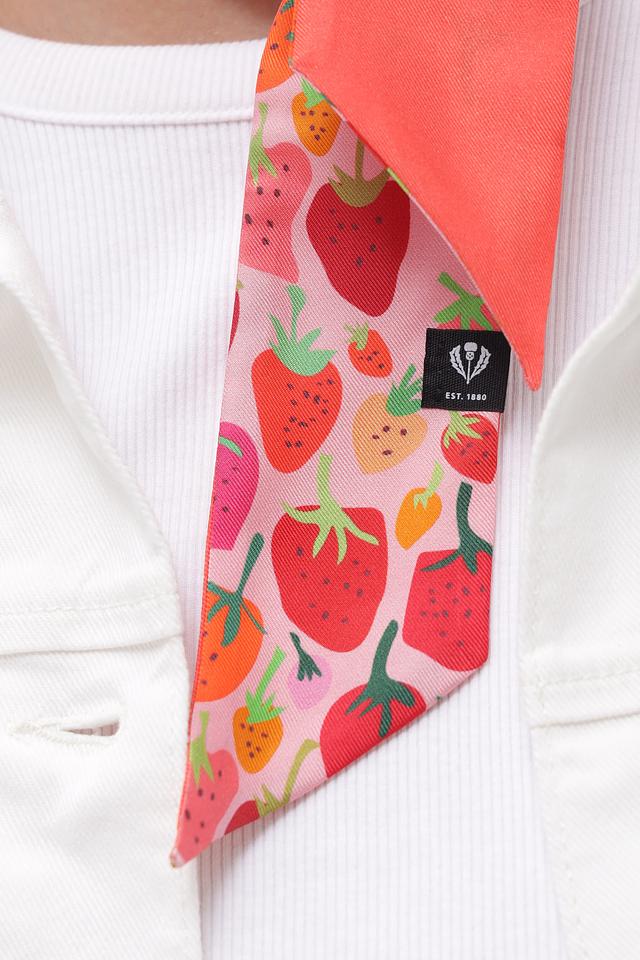 Основной цвет шарфа – нежно-розовый, который служит прекрасным фоном для красочного клубничного принта. На шарфе изображены сочные и аппетитные клубники различных оттенков красного и оранжевого, что придает ему игривый и летний вид.