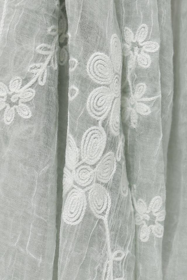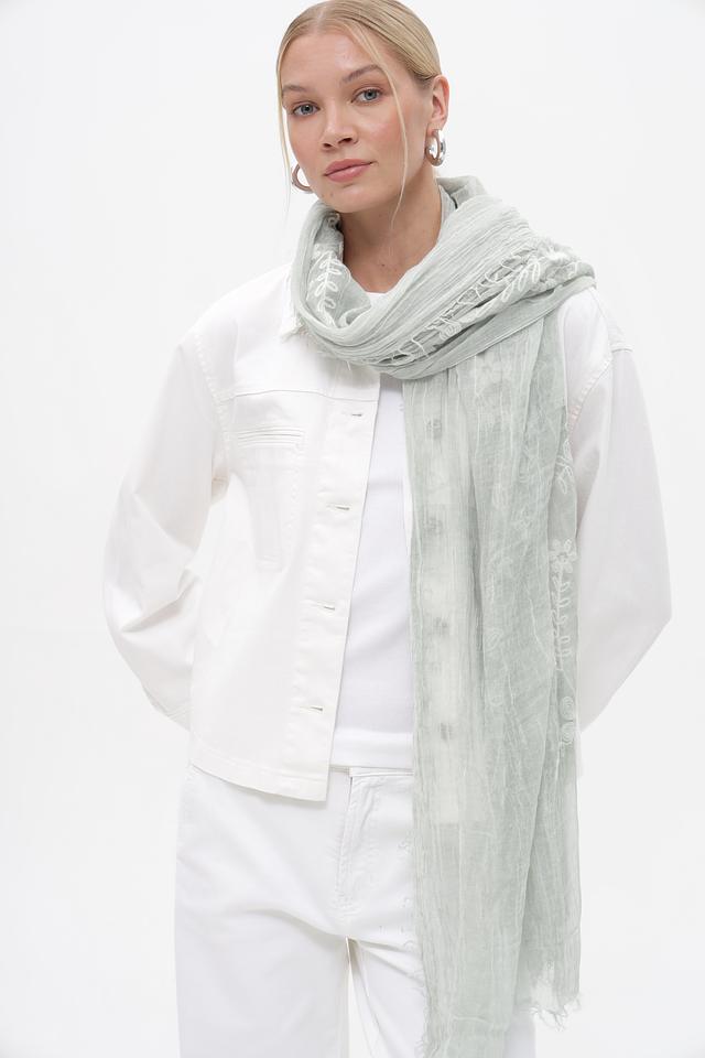 Этот шарф от Fraas выполнен в нежном мятном оттенке и украшен изысканной цветочной вышивкой. Изделие имеет прямоугольную форму и бахрому по краям, что придает ему дополнительный шарм.