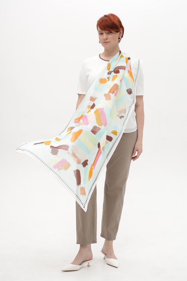 Шарф имеет прямоугольную форму и выполнен из сочетания хлопка (70%) и шелка (30%). Такое сочетание материалов обеспечивает приятные тактильные ощущения, мягкость и комфорт при ношении. Шарф легкий и воздушный, что делает его идеальным для любого времени года.