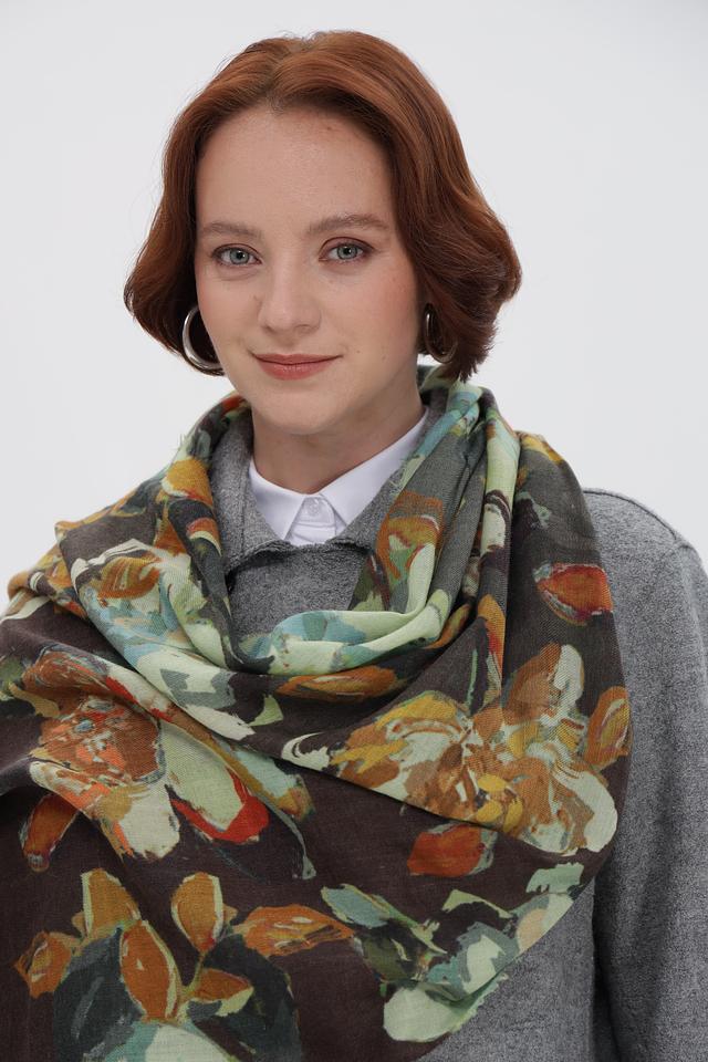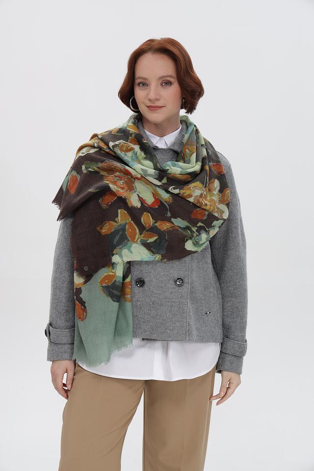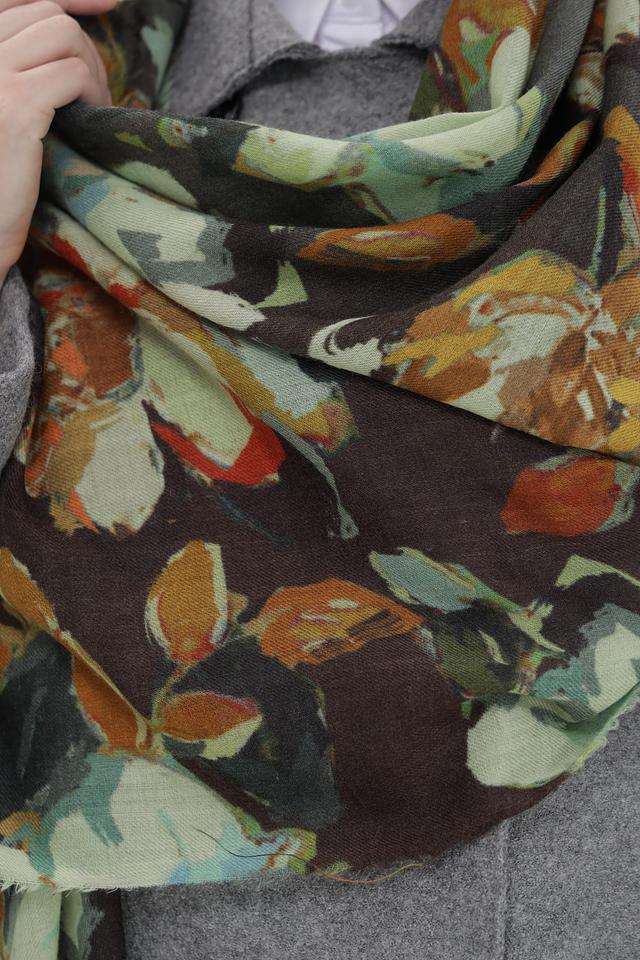 Шарф имеет оригинальный цветочный принт, выполненный в сочетании коричневого, зеленого, оранжевого и голубого цветов. Такое сочетание делает его универсальным дополнением к различным стилям одежды – от классического до повседневного.