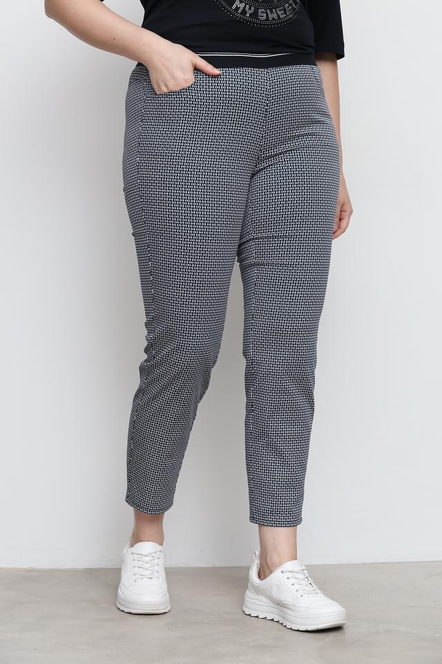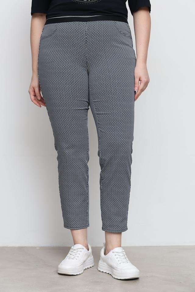 Женские брюки Frank Walder синего цвета с мелким клетчатым принтом. Модель выполнена из хлопка с добавлением эластана, обеспечивающего комфорт и свободу движений. Удобная посадка и стильный дизайн. Состав: хлопок 97%, эластан 3%