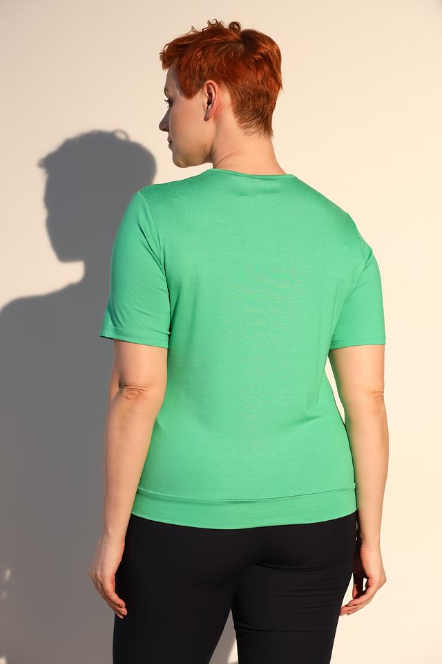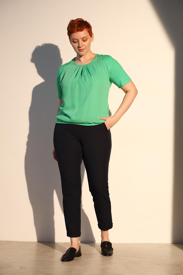 Блуза имеет прямой крой и короткие рукава. Особый акцент сделан на драпировке на горловине, которая придает образу женственность и изысканность. Цвет блузы – насыщенный зелёный, который отлично подойдет для создания ярких и стильных образов.