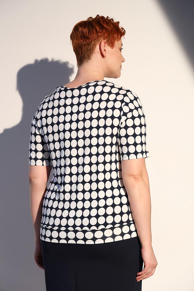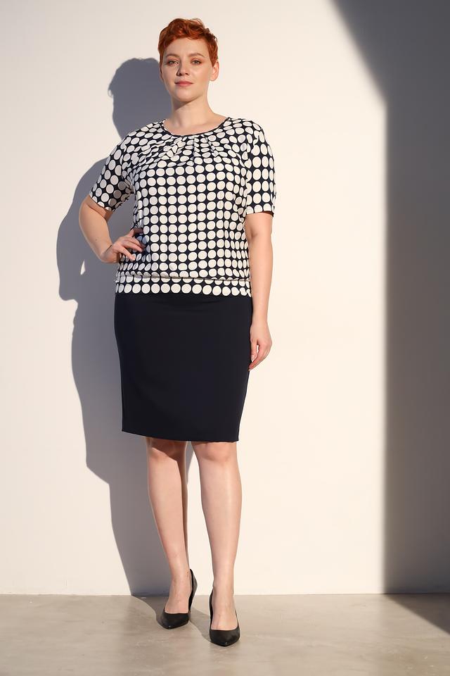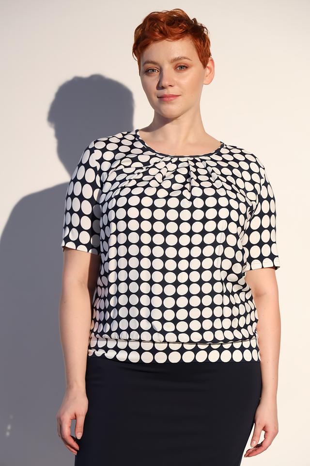 Блуза имеет классический крой с короткими рукавами и круглым вырезом горловины. Её украшает стильный принт в виде белого горошка на черном фоне, который придаёт ей игривый и женственный вид.