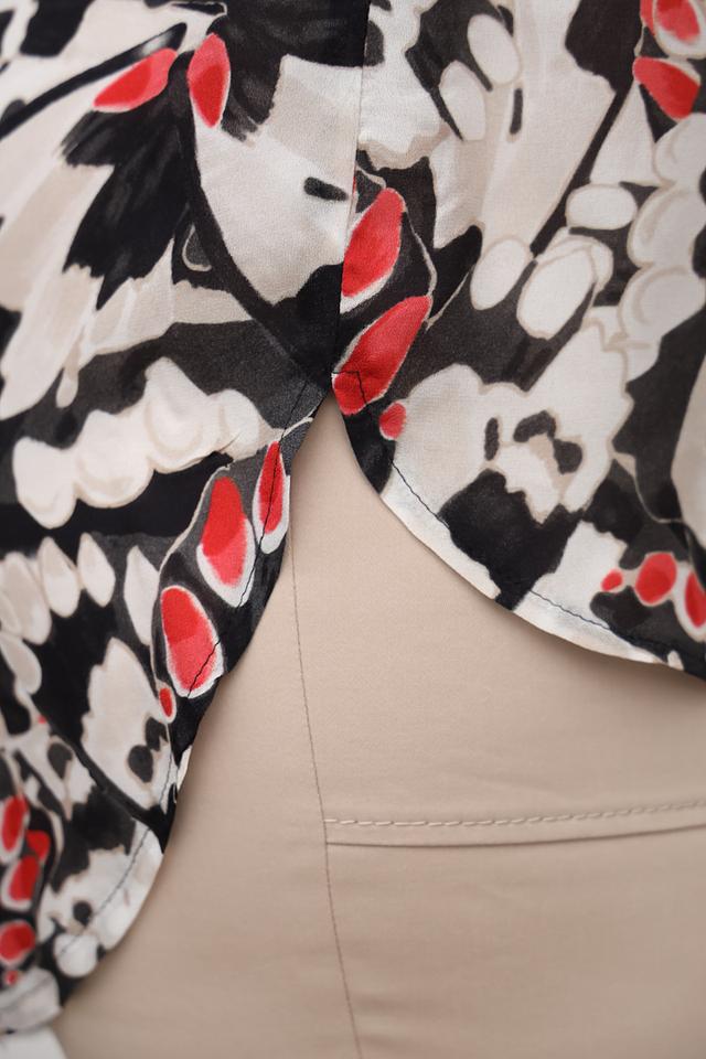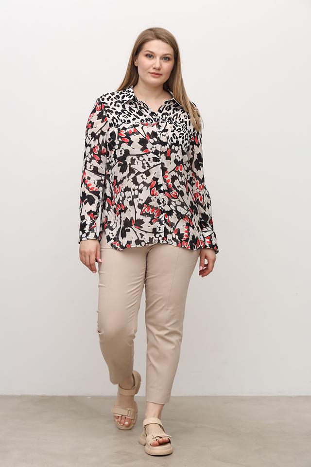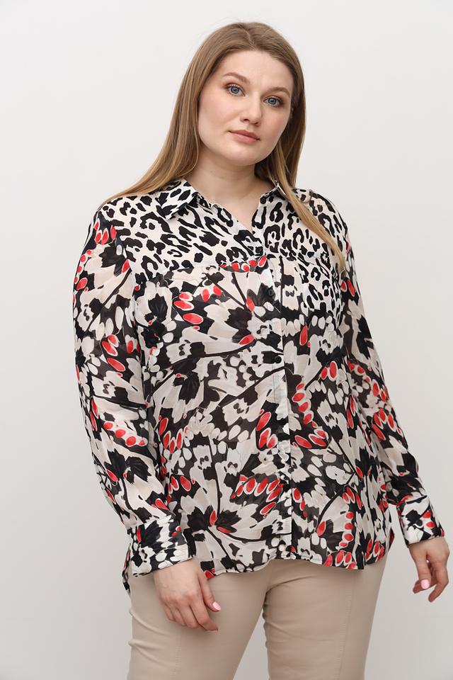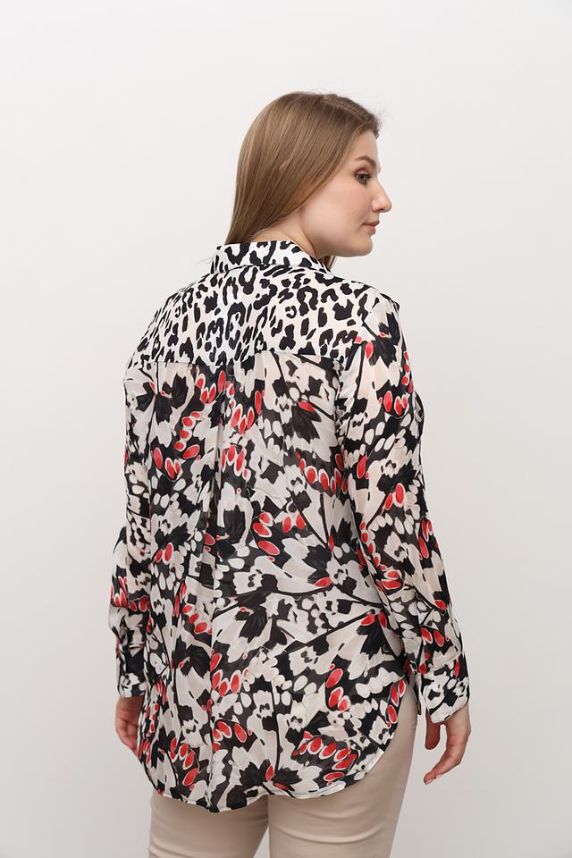Рубашка имеет классический крой с длинными рукавами и воротником. Её отличает эффектный принт, сочетающий в себе чёрные, белые и красные оттенки, создавая неповторимый визуальный эффект.