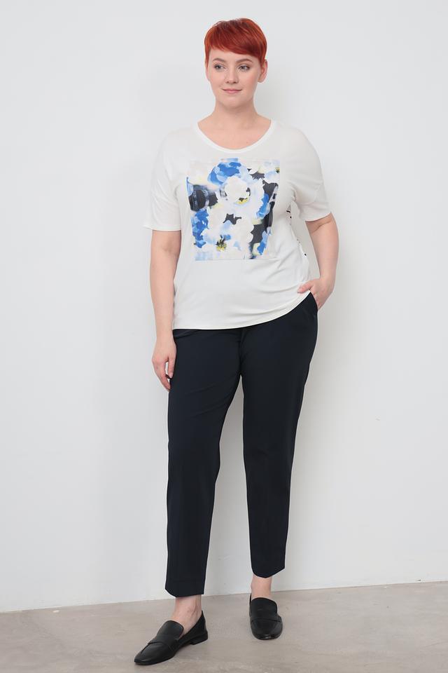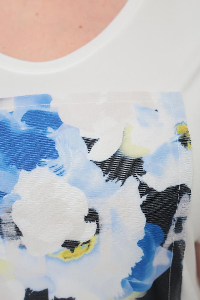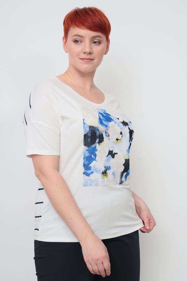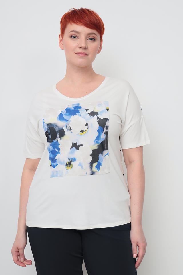Основной цвет футболки – белый, что делает ее универсальной и легко сочетаемой с другими элементами одежды. Главная особенность модели – яркий цветочный принт на лицевой стороне, выполненный в сине-голубых тонах с добавлением желтых акцентов.