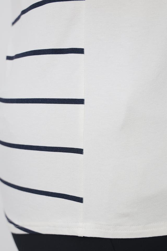Задняя часть футболки выполнена в горизонтальную полоску, сочетающую белый и темно-синий цвета. Крой футболки свободный, что обеспечивает дополнительный комфорт. Короткие рукава делают ее идеальным выбором для теплой погоды.