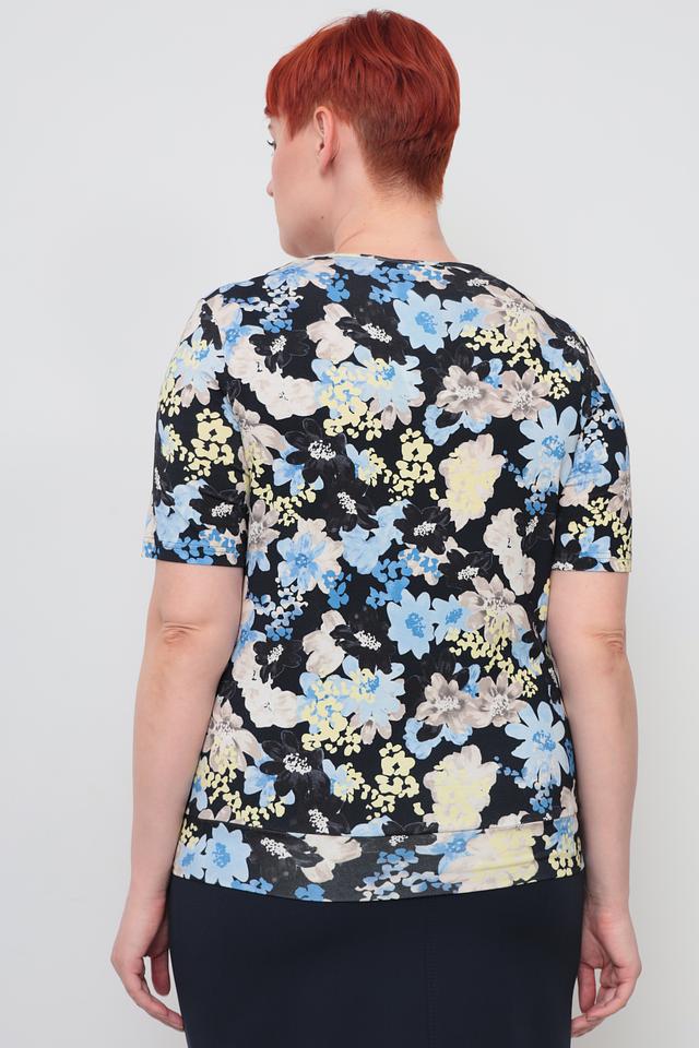 Модель имеет округлый вырез горловины и короткие рукава. Блуза выполнена из качественной вискозы с добавлением эластана, что обеспечивает мягкость, комфорт и хорошую посадку по фигуре. Ткань приятна к телу и хорошо драпируется.