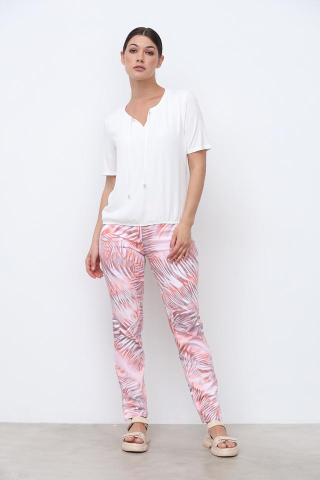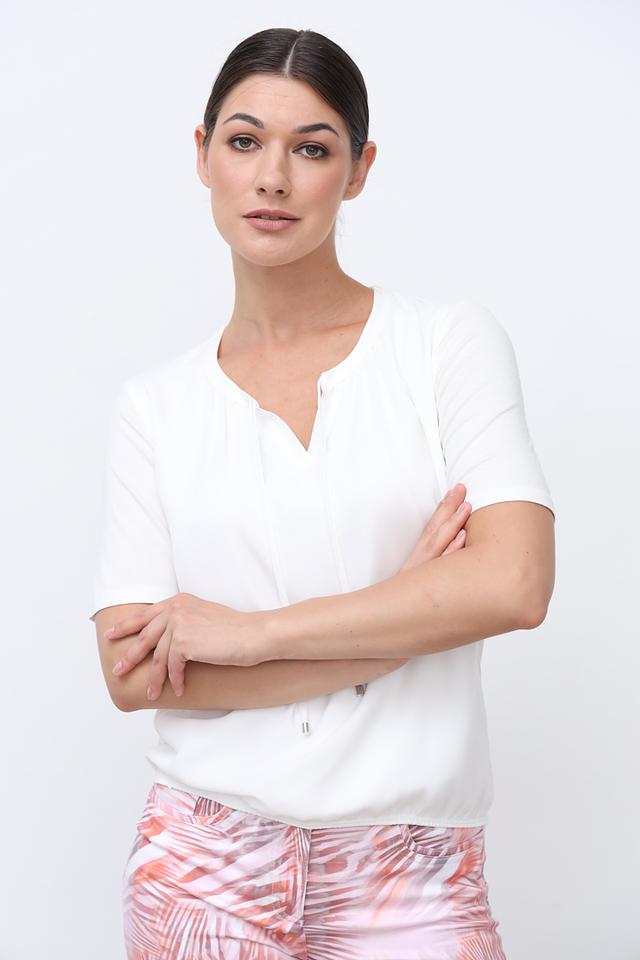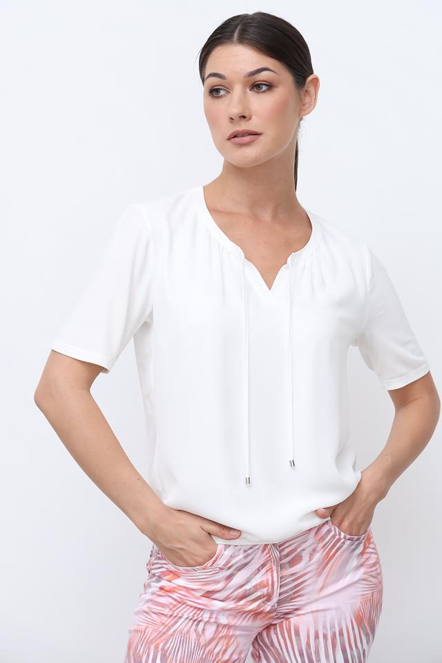 Модель имеет короткие рукава и V-образный вырез горловины, который украшен небольшими завязками. Эти завязки добавляют блузе оригинальности и позволяют регулировать глубину выреза.