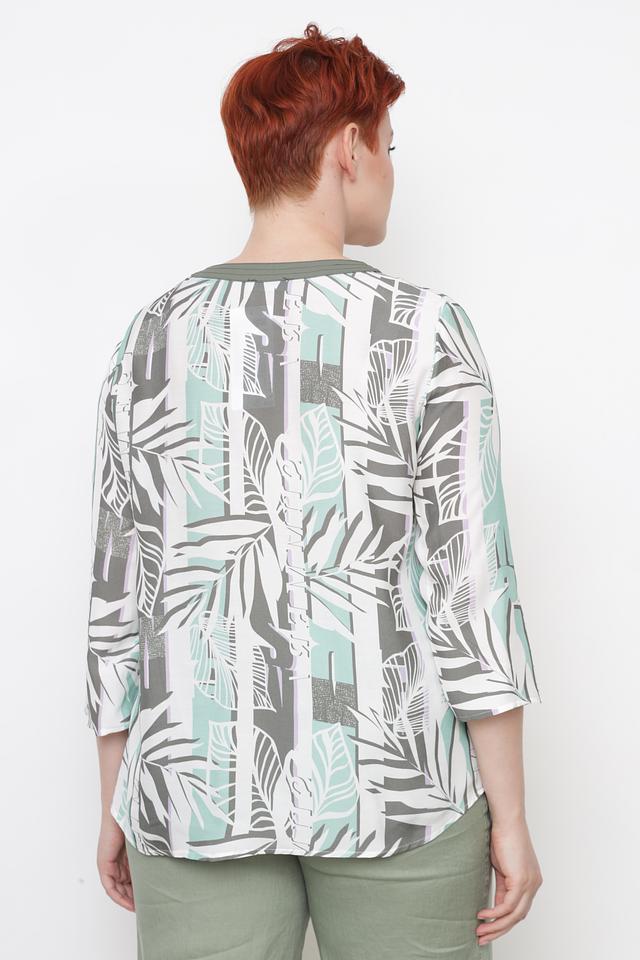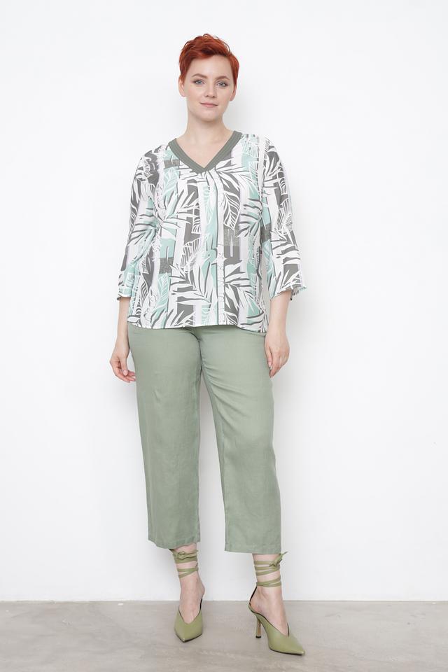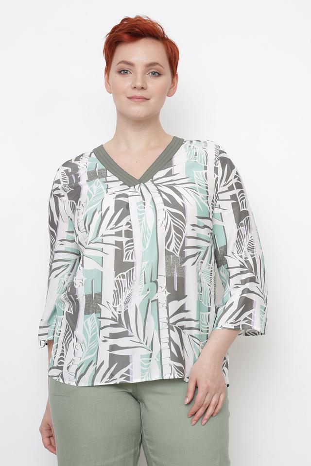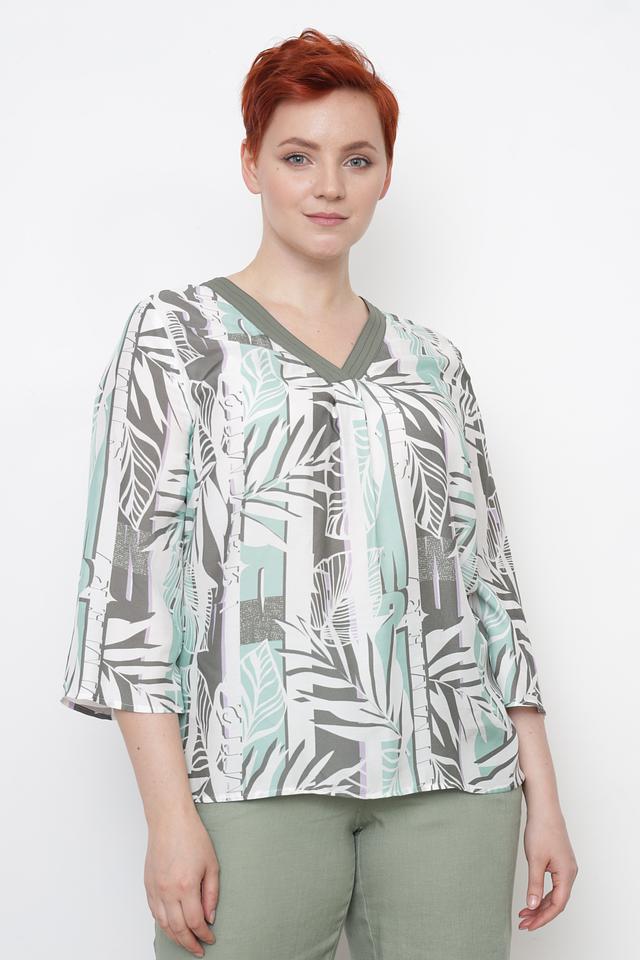 Особенностью данной модели является яркий и оригинальный принт с изображением тропических листьев в оттенках зеленого, серого и белого. Такой рисунок добавит вашему образу свежести и индивидуальности.