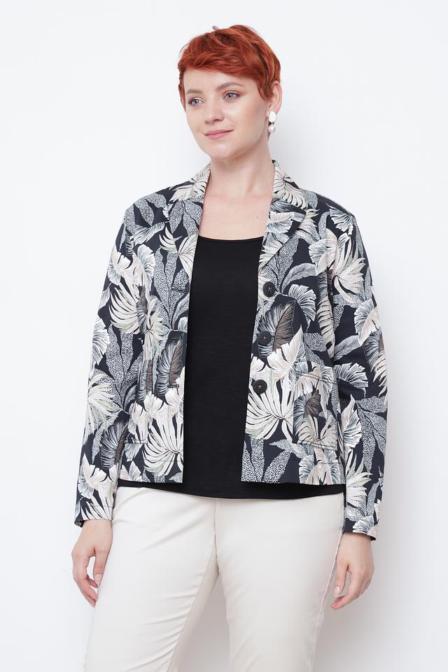 Жакет имеет классический крой с лацканами и застежкой на пуговицы. Длинные рукава и удобная посадка обеспечивают комфорт в носке.