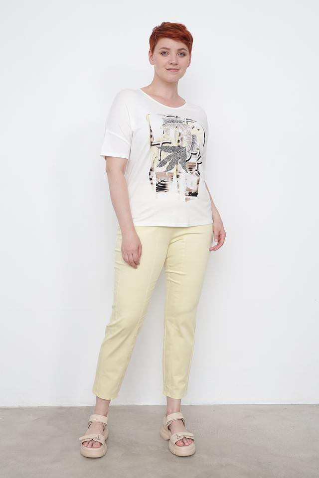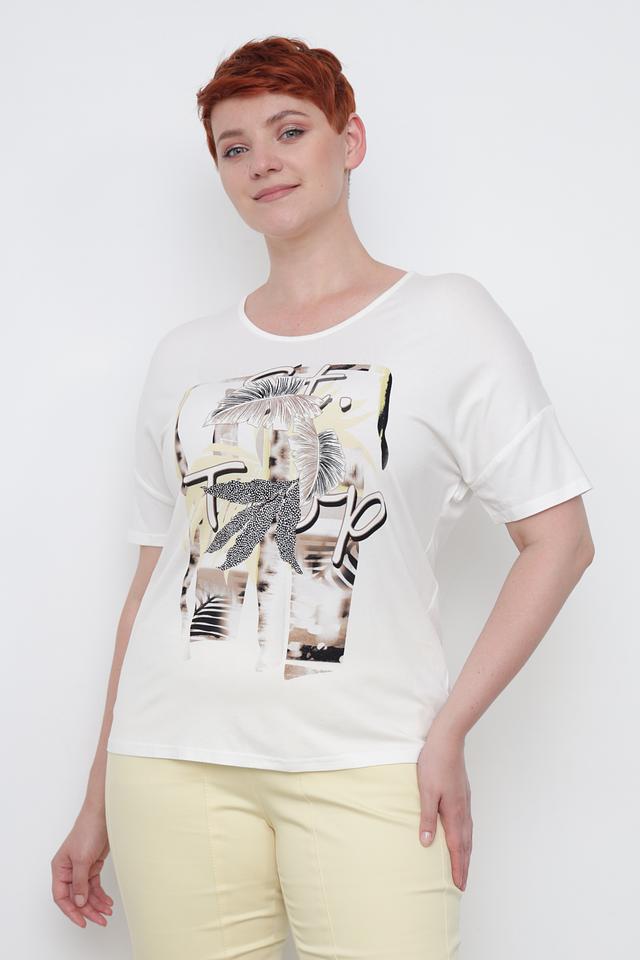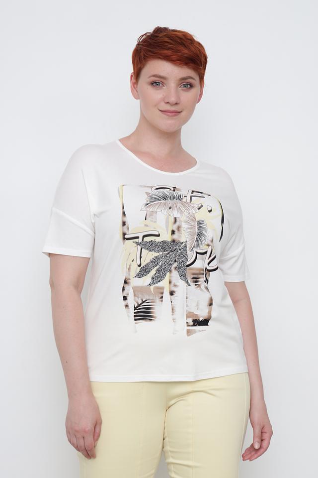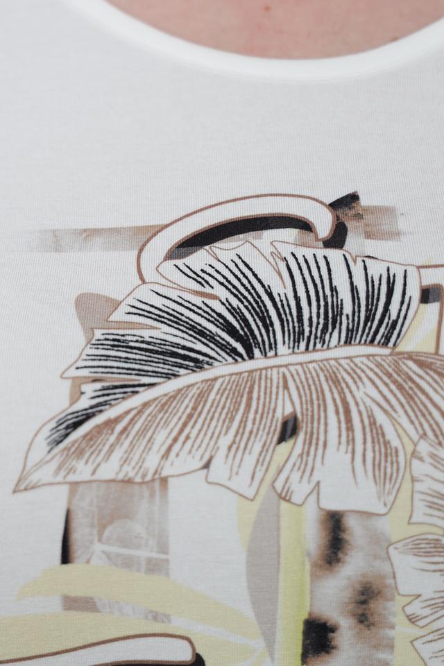 Основной цвет футболки – белый, что делает ее универсальной и легко сочетаемой с другими элементами одежды. Главная особенность модели – яркий и стильный принт с изображением тропических листьев и геометрических фигур.