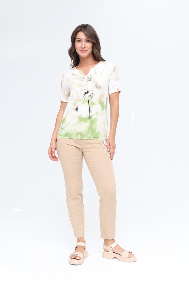 Модель имеет прямой крой, короткие рукава и V-образный вырез горловины. Блуза изготовлена из высококачественной вискозы с добавлением эластана, что обеспечивает приятные тактильные ощущения и хорошую посадку по фигуре.