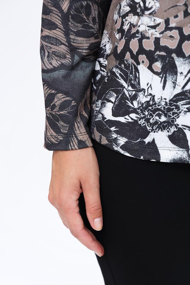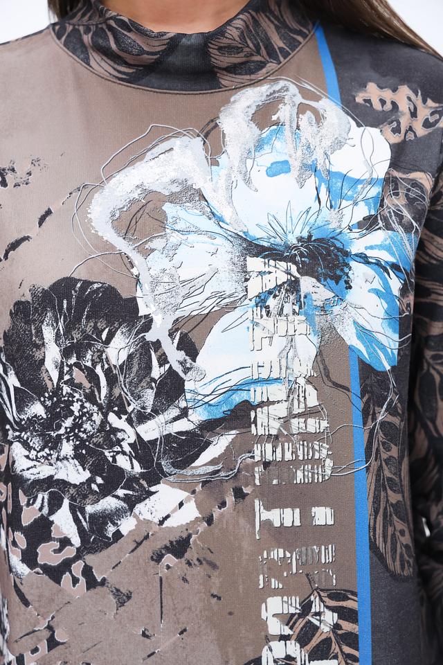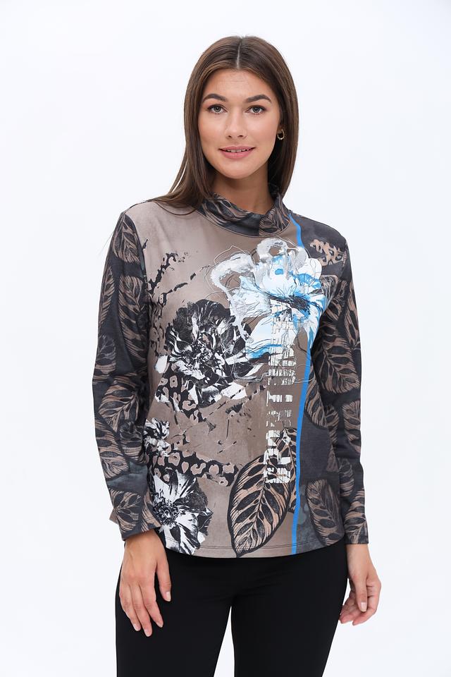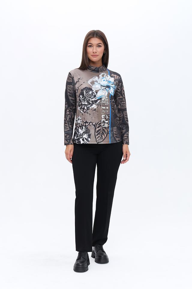Блуза имеет длинные рукава и высокий воротник-стойку, что делает ее подходящей для прохладной погоды. Основной цвет блузы – серый, но ее украшает яркий и красочный цветочный принт, который добавляет образу оригинальности и свежести.