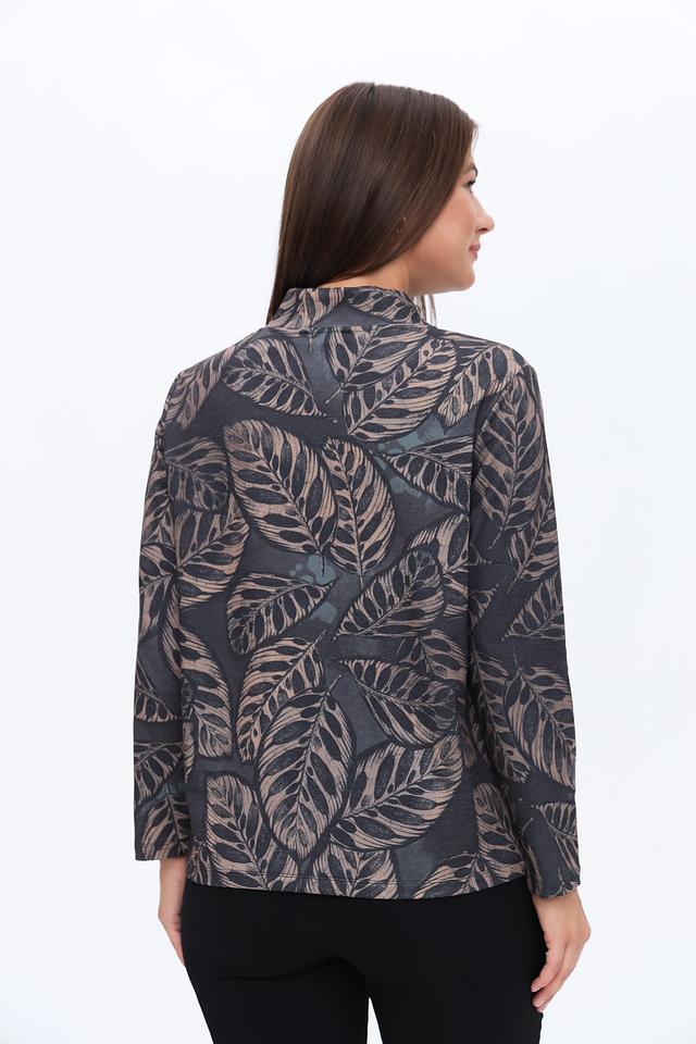 Принт выполнен в виде абстрактных цветов и листьев, выполненных в голубых, белых, коричневых и черных тонах. Сочетание этих цветов создает интересный визуальный эффект. Блуза идеально подойдет для повседневной носки, а также для особых случаев.