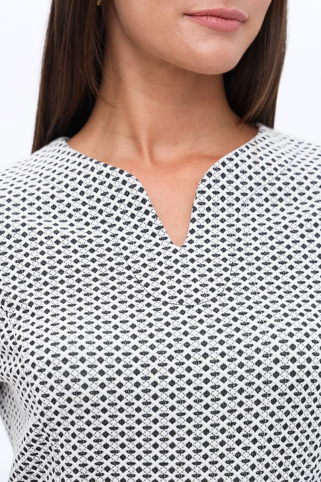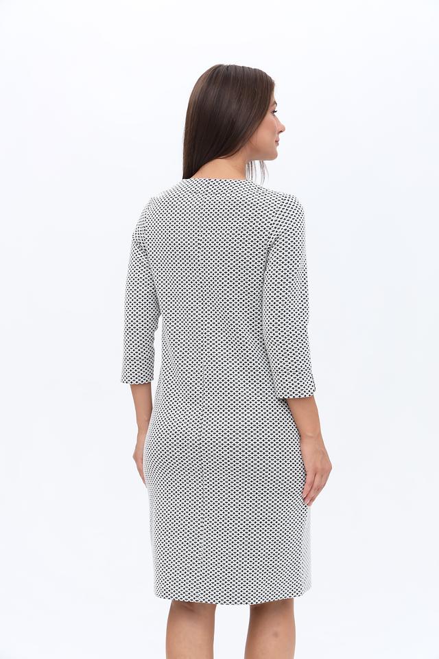 Модель имеет приталенный силуэт, который подчеркивает фигуру, и длину до колена. Рукава длиной 3/4 делают платье подходящим для различных сезонов. V-образный вырез горловины добавляет изящества.