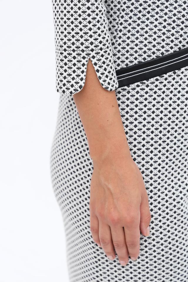 Это стильное платье от Frank Walder станет прекрасным дополнением к вашему гардеробу. Платье выполнено в белом цвете с мелким чёрным рисунком в горошек, что придает ему классический и элегантный вид.