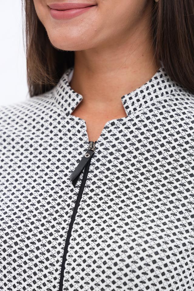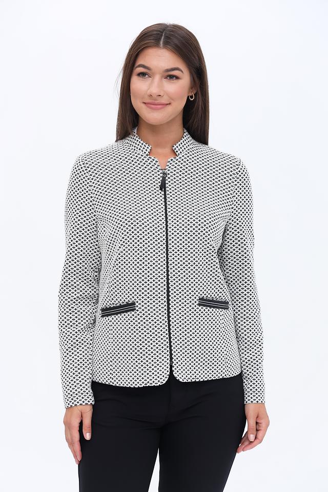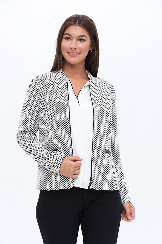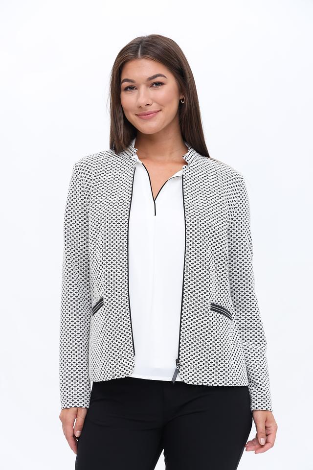 Жакет имеет классический крой с лацканами и застёжкой на молнию. Длинные рукава и приталенный силуэт подчеркнут вашу фигуру. Модель выполнена из высококачественного материала, сочетающего в себе хлопок, полиэстер и эластан, что обеспечивает комфорт в носке и отличную посадку по фигуре.