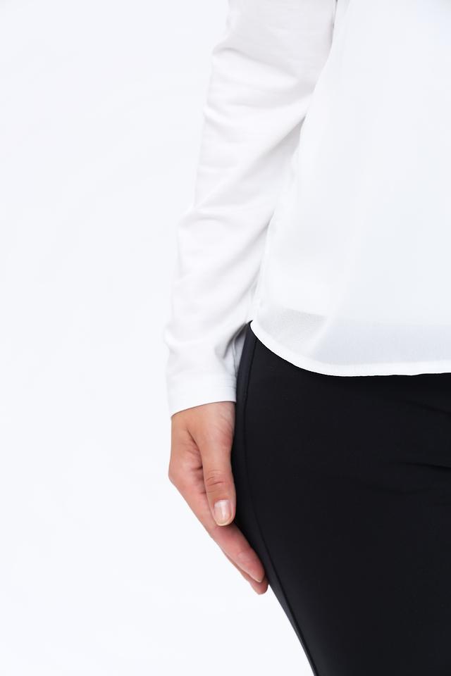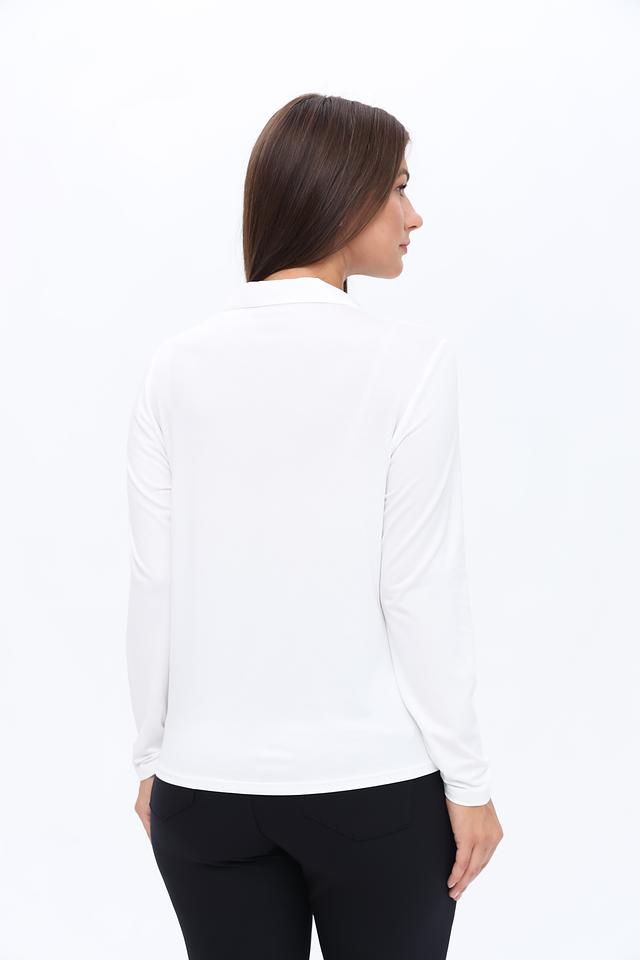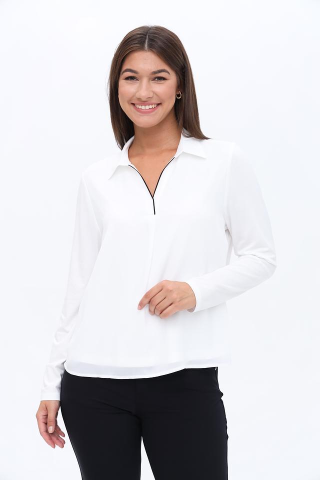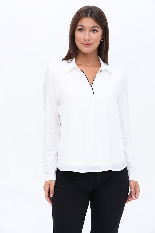 Белая блуза Frank Walder с длинными рукавами и V-образным вырезом. Модель выполнена из лёгкой вискозы с добавлением эластана, что обеспечивает комфорт и удобство в носке. Идеально подходит для создания элегантных и повседневных образов. Состав: вискоза 93%, эластан 7%