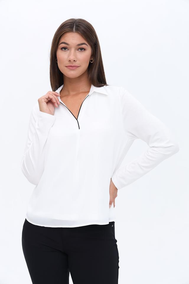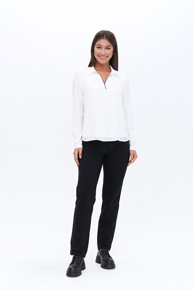 Блуза имеет длинные рукава и V-образный вырез, который визуально удлиняет шею и делает силуэт более изящным. Материал – вискоза с добавлением эластана – приятен к телу, хорошо драпируется и обеспечивает комфорт при носке.