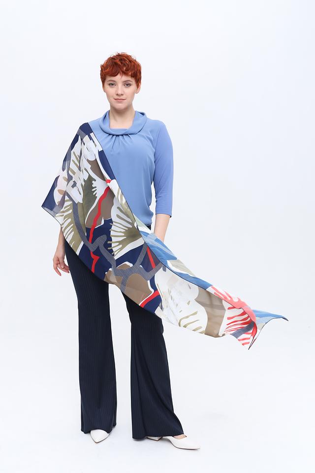 Дизайн шарфа представлен оригинальным тропическим принтом, сочетающим в себе различные оттенки синего, зеленого, белого и красного. Такое сочетание цветов позволяет легко сочетать шарф с различными элементами одежды.