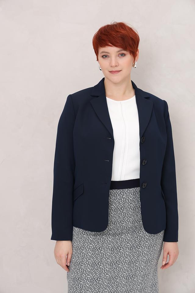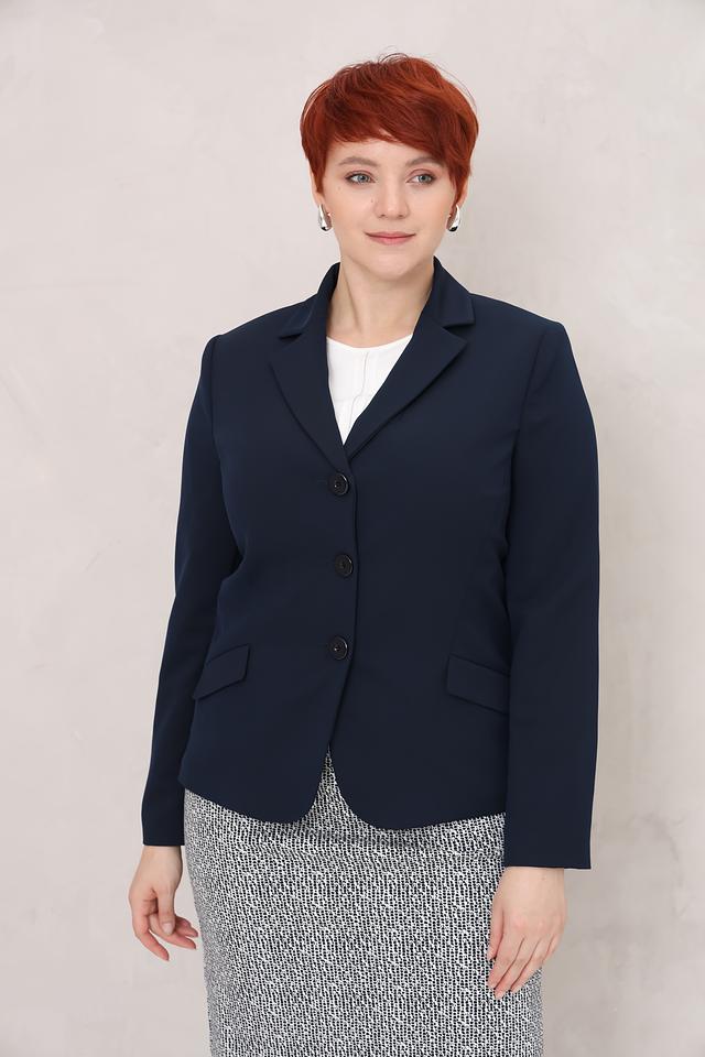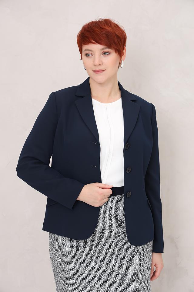Жакет имеет приталенный силуэт, который подчеркивает фигуру, и застегивается на три пуговицы в тон изделия. Отложной воротник добавляет жакету строгости и делового вида. Длинные рукава обеспечивают комфорт в прохладную погоду.