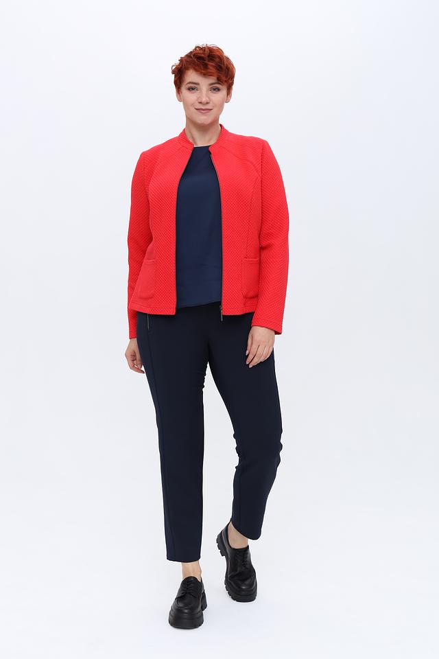 Жакет имеет приталенный силуэт, который подчеркивает фигуру, и застегивается на молнию. Воротник-стойка добавляет изделию лаконичности. Два функциональных кармана на молнии обеспечивают удобство и практичность.