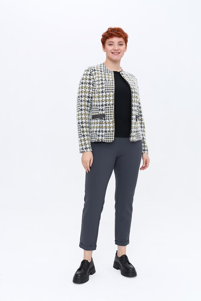 Жакет изготовлен из смеси полиэстера, полиамида и вискозы, что обеспечивает ему прочность, износостойкость и приятные тактильные ощущения. Состав ткани: 49% полиэстер, 30% полиамид, 21% вискоза.