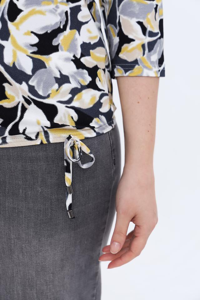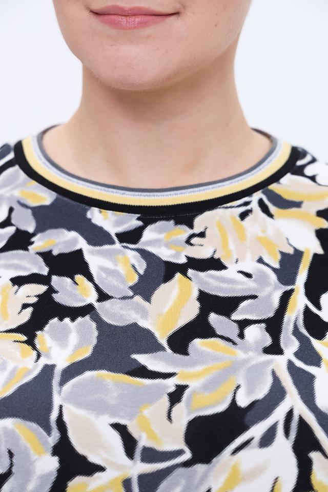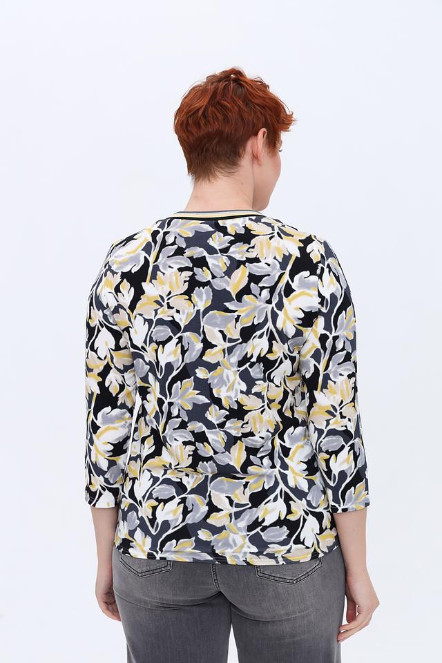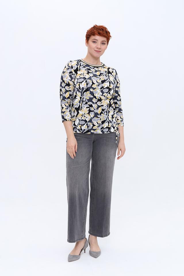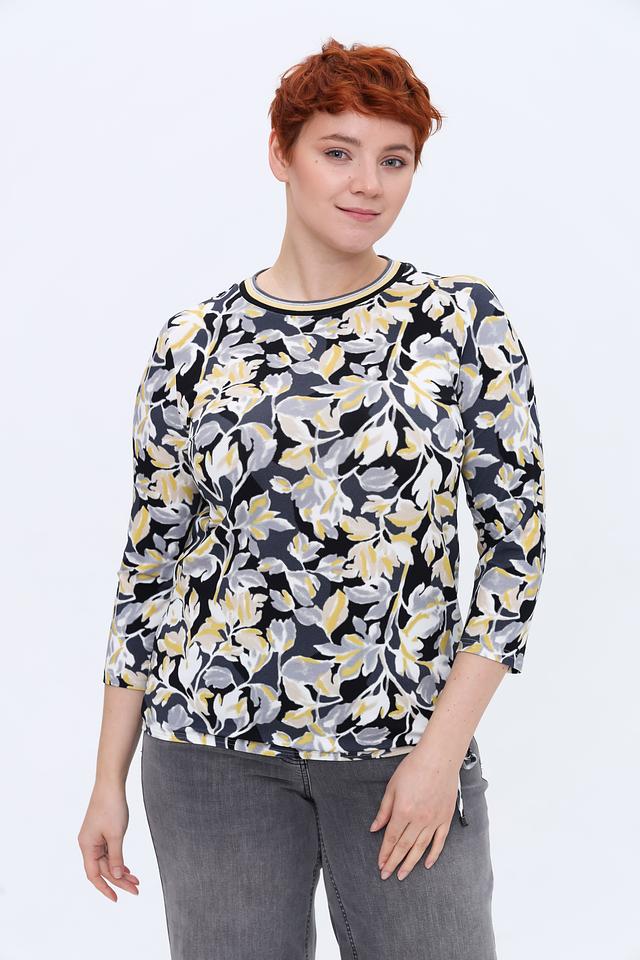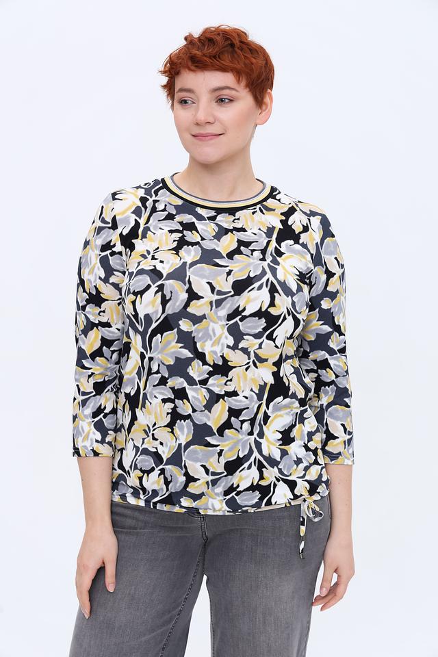 Основным элементом дизайна является яркий цветочный принт, выполненный в сочетании жёлтых, серых и белых оттенков на чёрном фоне. Такой рисунок добавляет образу женственности и свежести. Лонгслив идеально сочетается с джинсами, брюками или юбками, позволяя создавать как повседневные, так и более нарядные комплекты.