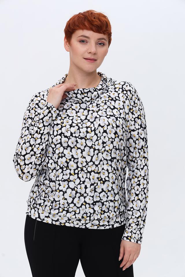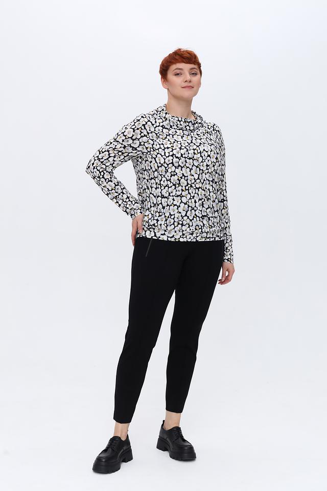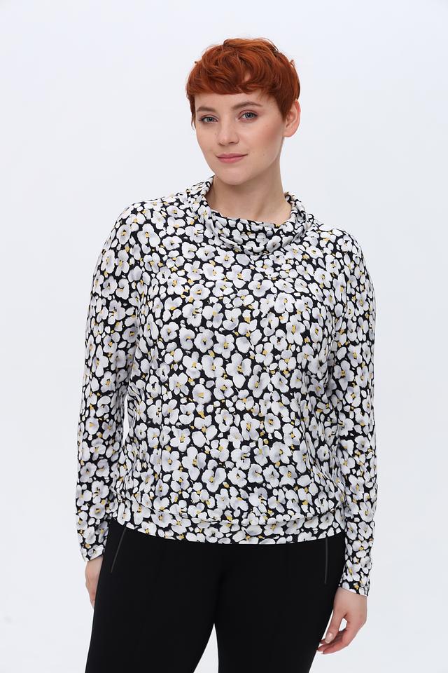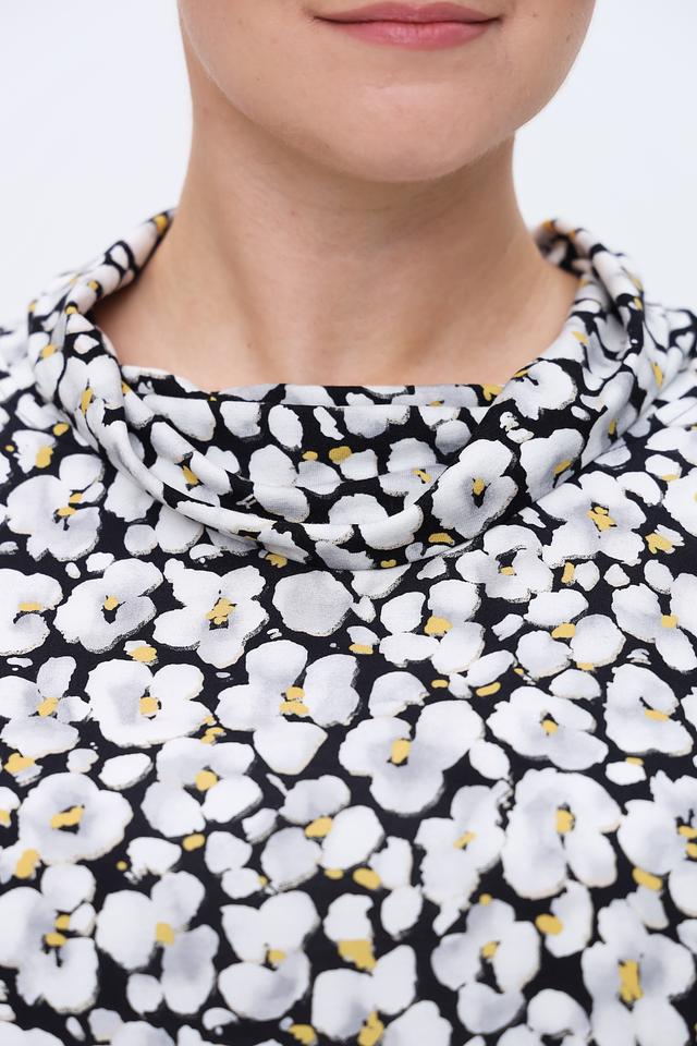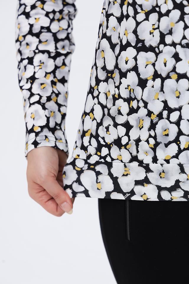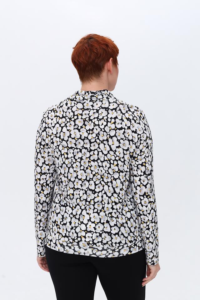Основной цвет блузы – чёрный, который служит прекрасным фоном для яркого цветочного принта. Принт состоит из абстрактных изображений цветов в белых, жёлтых и светло-зелёных тонах. Высокий воротник-стойка добавляет блузе изысканности и оригинальности.
