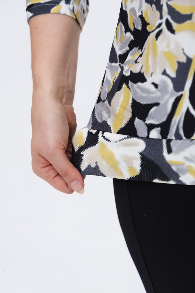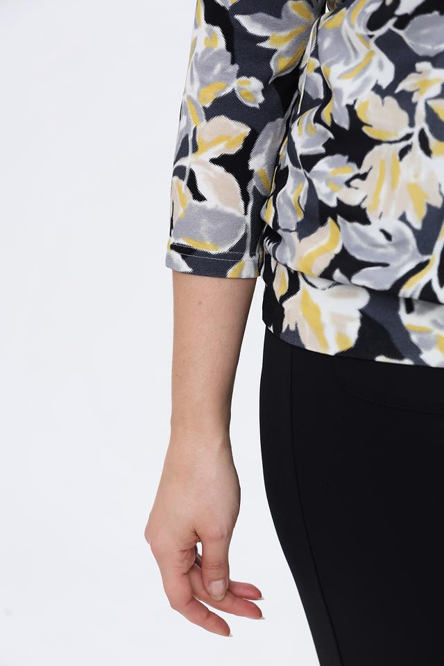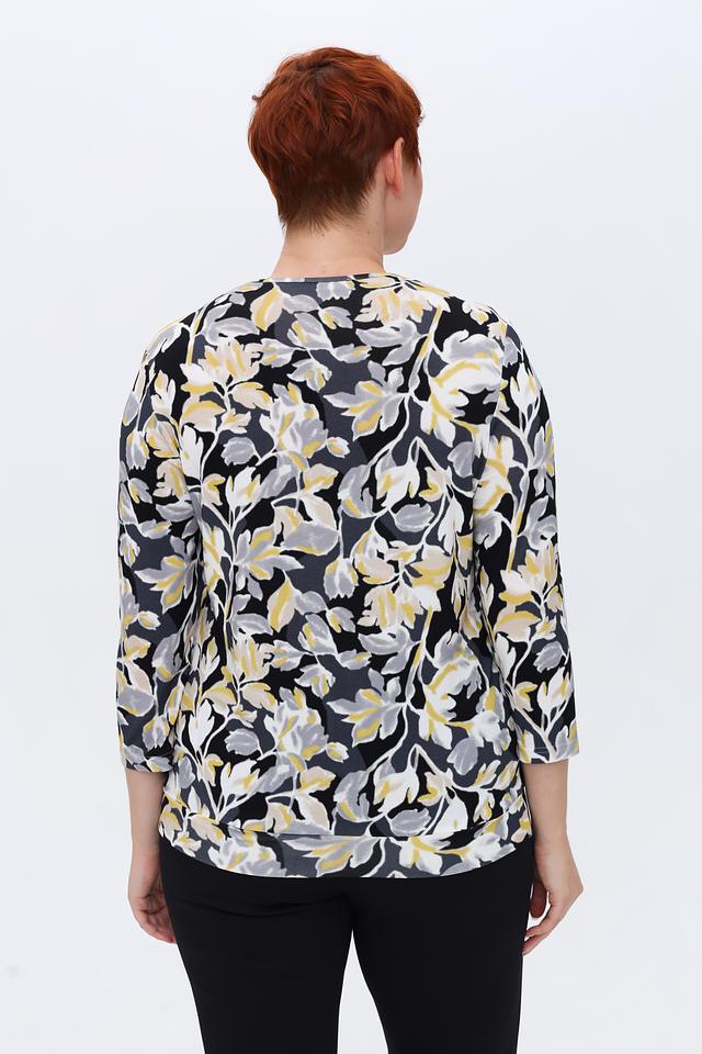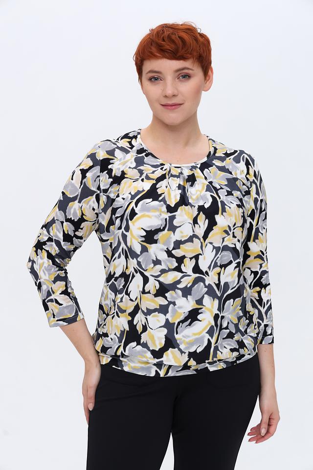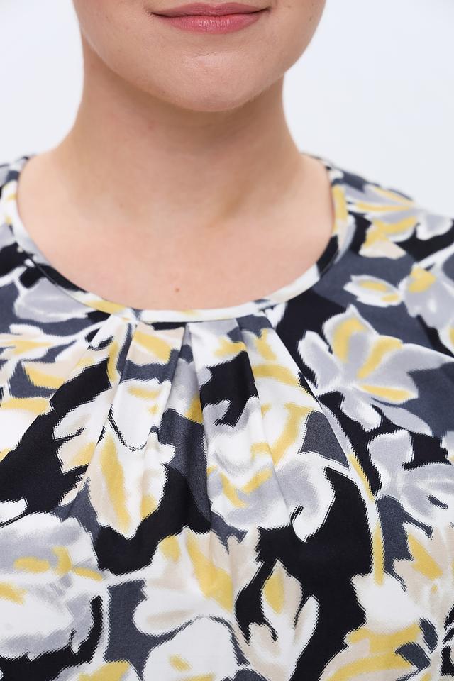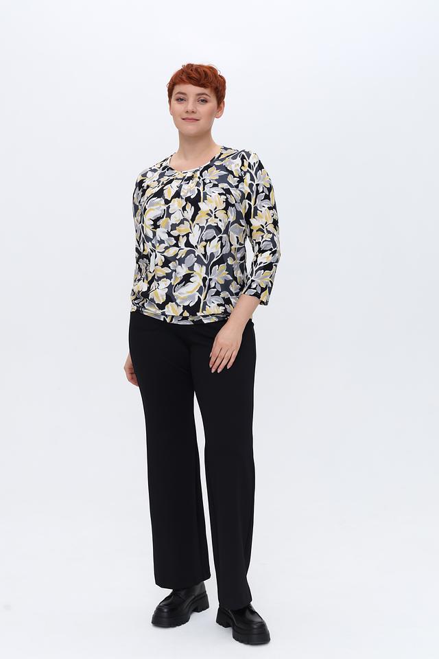 Основной цвет блузы – чёрный, который служит идеальным фоном для яркого цветочного принта. Принт выполнен в сочетании жёлтых, серых и белых оттенков, создавая эффектный и запоминающийся дизайн.