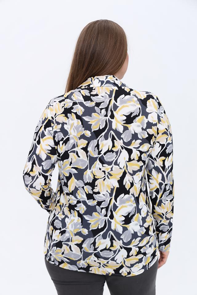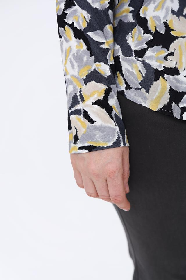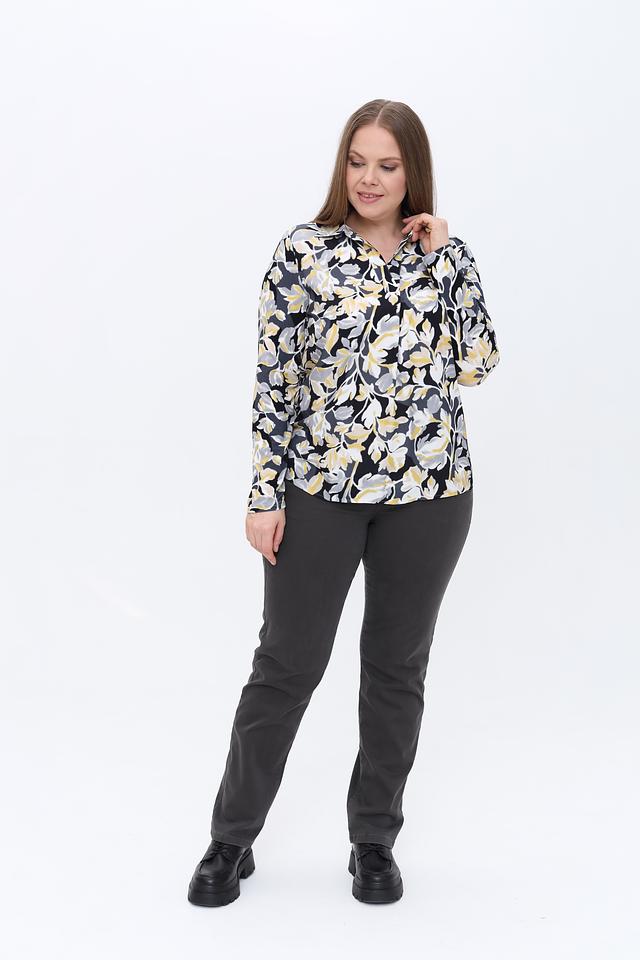 Основной цвет блузы – черный, который служит прекрасным фоном для яркого цветочного принта. Принт состоит из абстрактных изображений цветов в желтых, серых и белых тонах, создавая эффектный и запоминающийся дизайн.