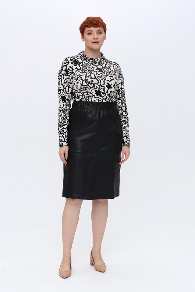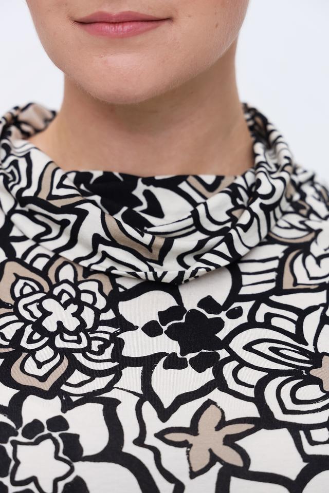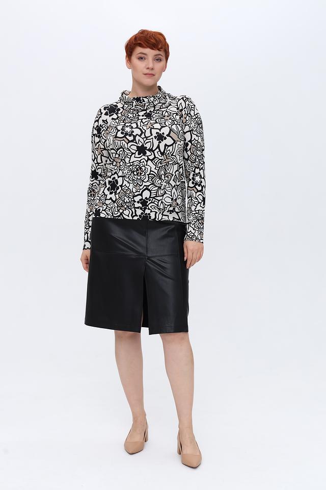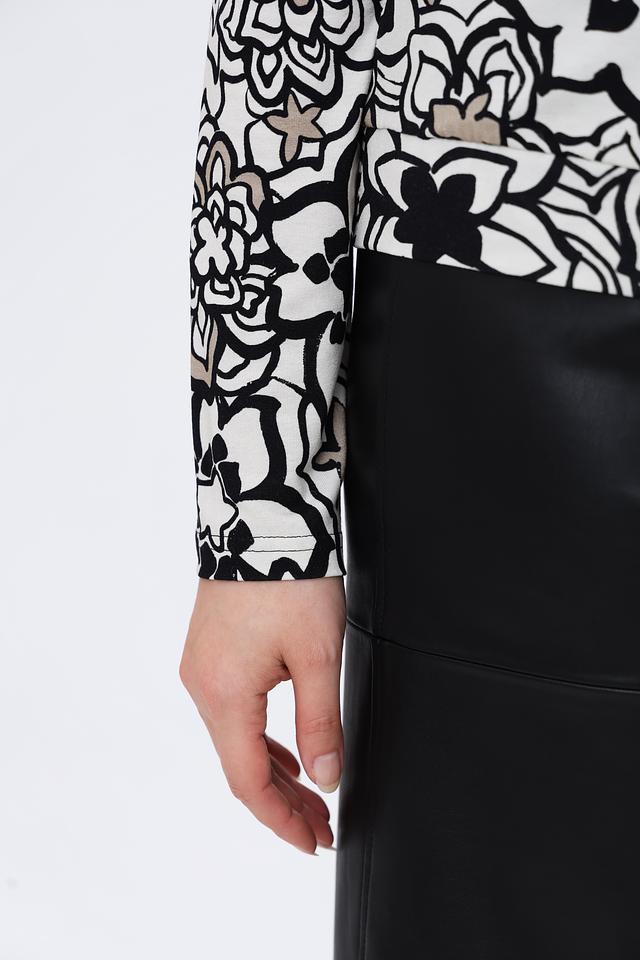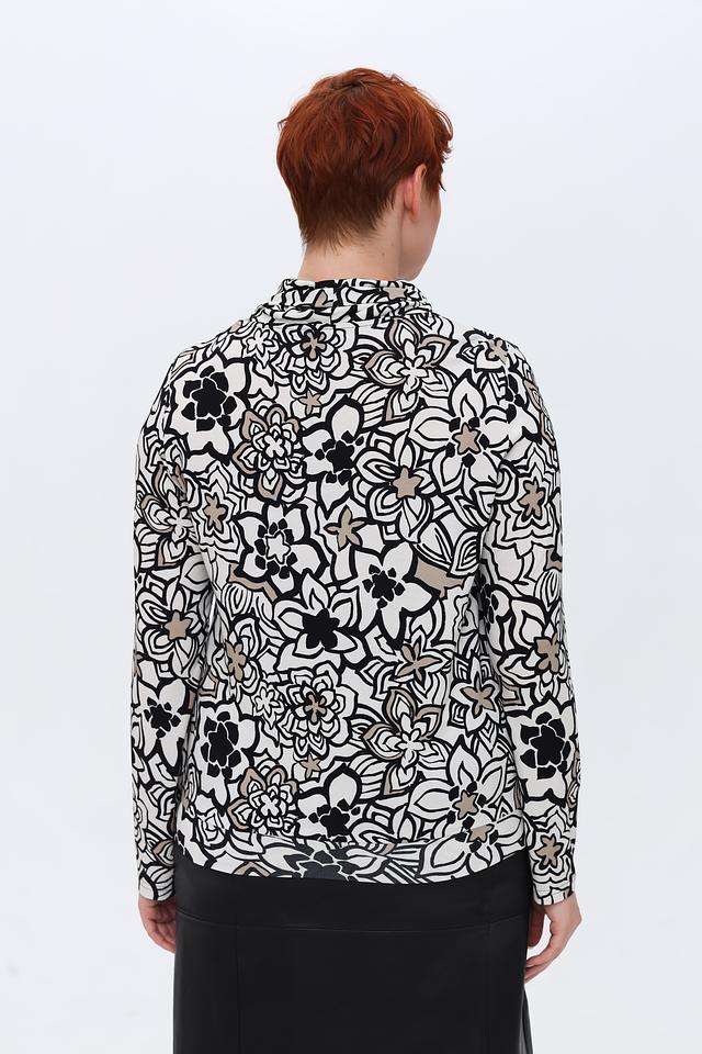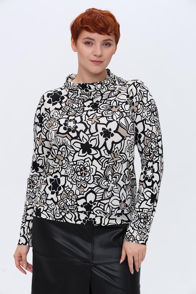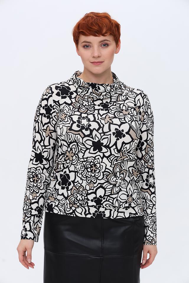 Лонгслив имеет классический крой с длинными рукавами и круглым вырезом горловины. Главной особенностью модели является яркий и запоминающийся цветочный принт, выполненный в контрастных чёрных и серых тонах на белом фоне. Такой рисунок добавит вашему образу свежести и оригинальности.