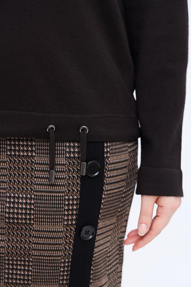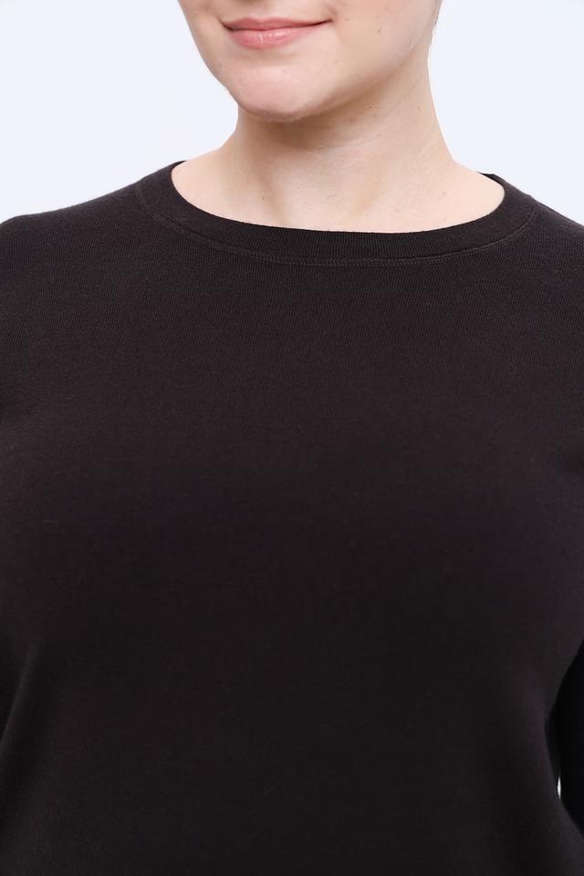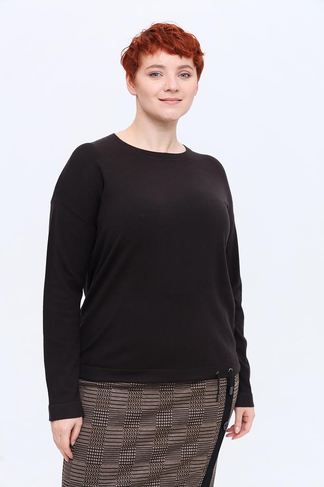 Модель имеет прямой крой и круглый вырез горловины, что делает её универсальной и подходящей для разных типов фигуры. Длинные рукава обеспечивают комфорт в прохладную погоду.