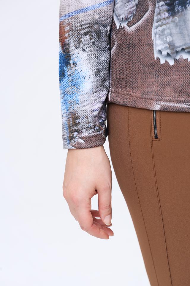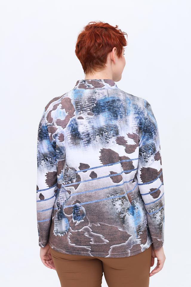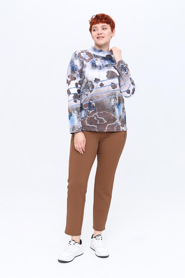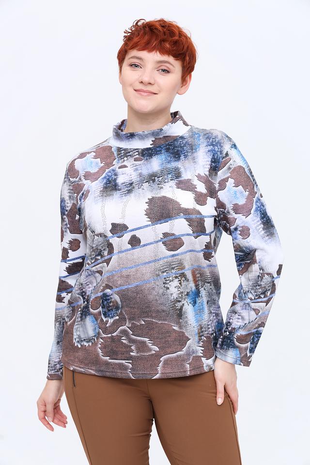 Пуловер имеет высокий воротник-стойку, который добавляет образу элегантности. Главная особенность изделия – яркий и необычный принт, сочетающий в себе оттенки синего, коричневого и белого. Такой рисунок сделает ваш образ запоминающимся и оригинальным.