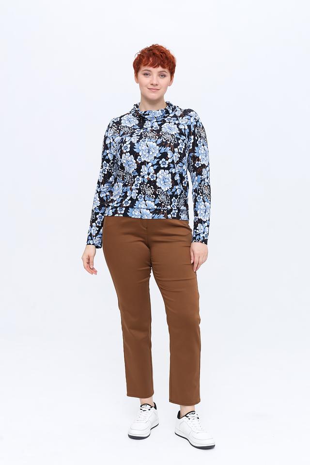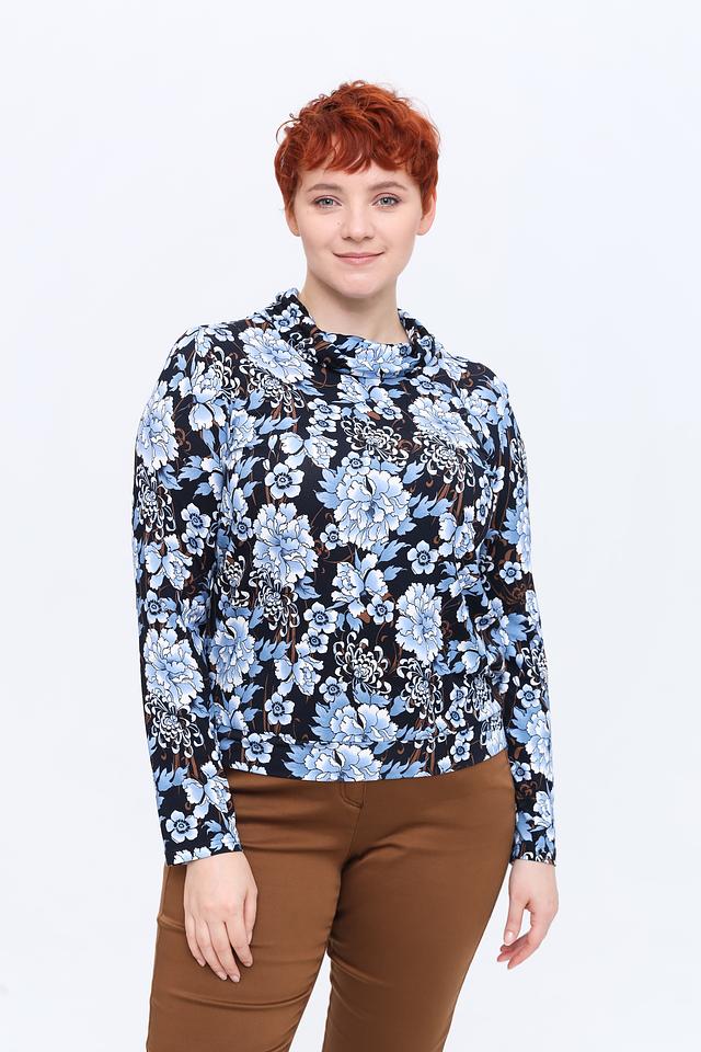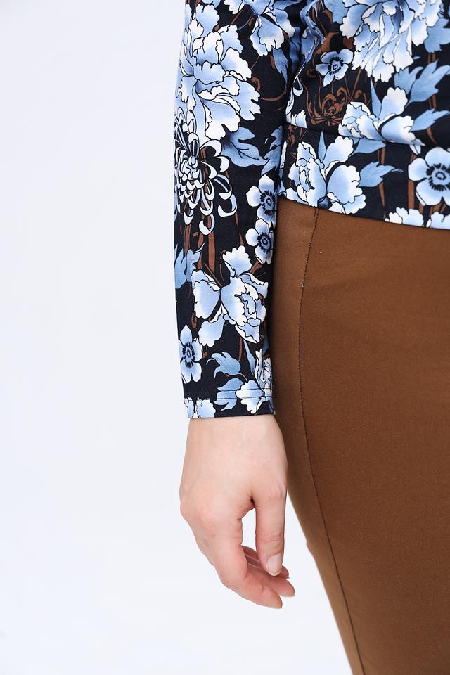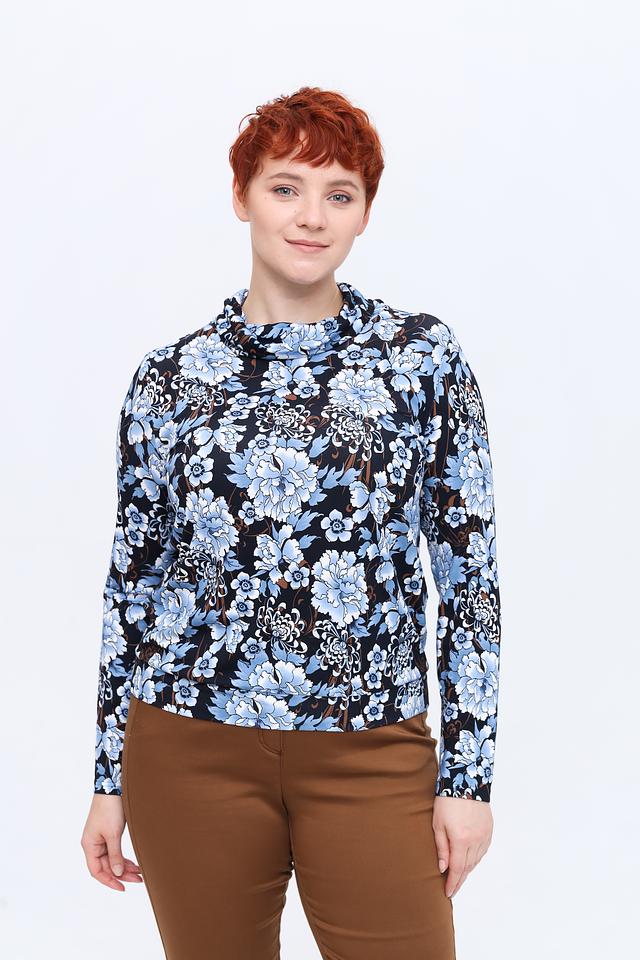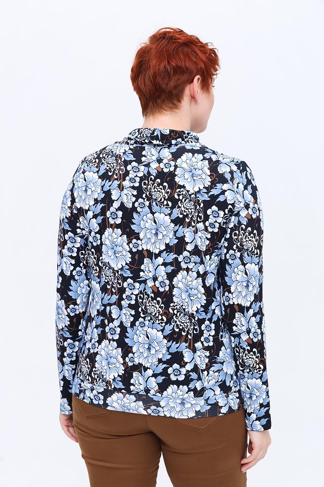 Основной цвет блузы – тёмно-синий, который служит идеальным фоном для яркого цветочного принта. Принт выполнен в голубых и белых тонах, создавая свежий и романтичный вид. Блуза имеет удобный вырез горловины и длинные рукава.