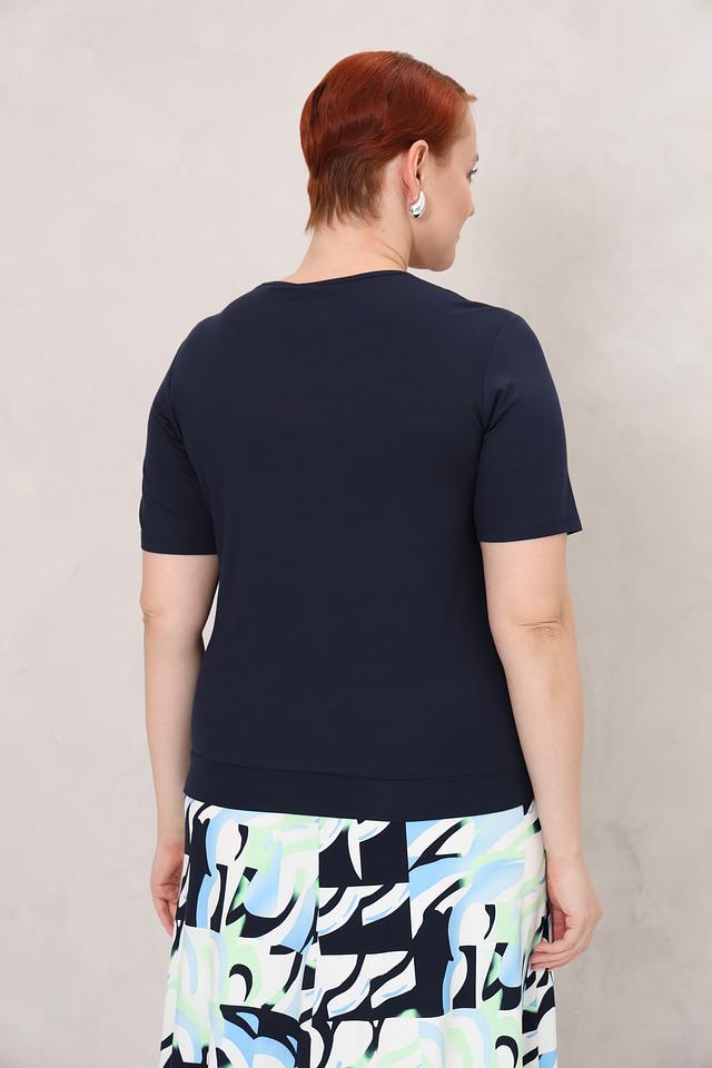 Темно-синяя блуза Frank Walder из вискозы с короткими рукавами и округлым вырезом. Модель дополнена элегантной драпировкой в области горловины, придающей образу женственность и изысканность. Состав: вискоза 93%, эластан 7%