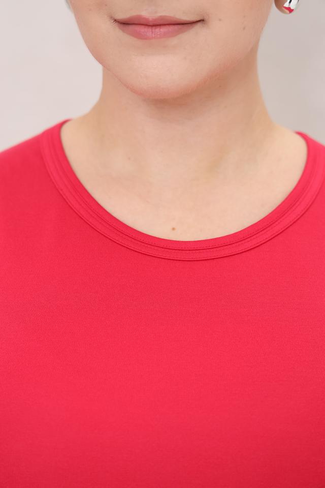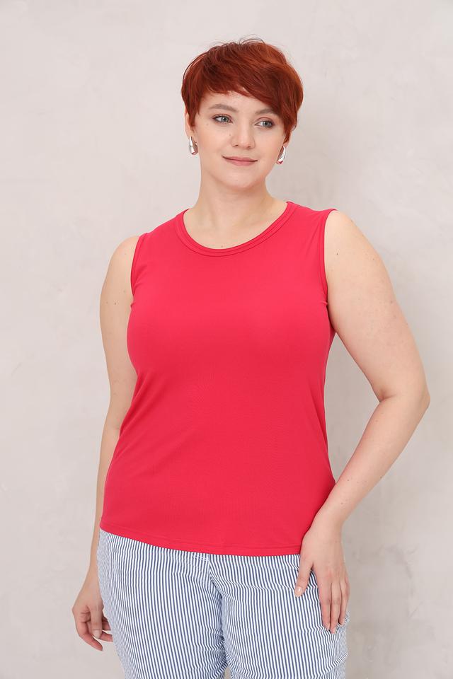 Топ имеет классический крой без рукавов и круглый вырез горловины. Насыщенный малиновый цвет делает его ярким и привлекательным. Благодаря простому дизайну, этот топ легко сочетается с различными элементами одежды — от джинсов и шорт до юбок и брюк.
