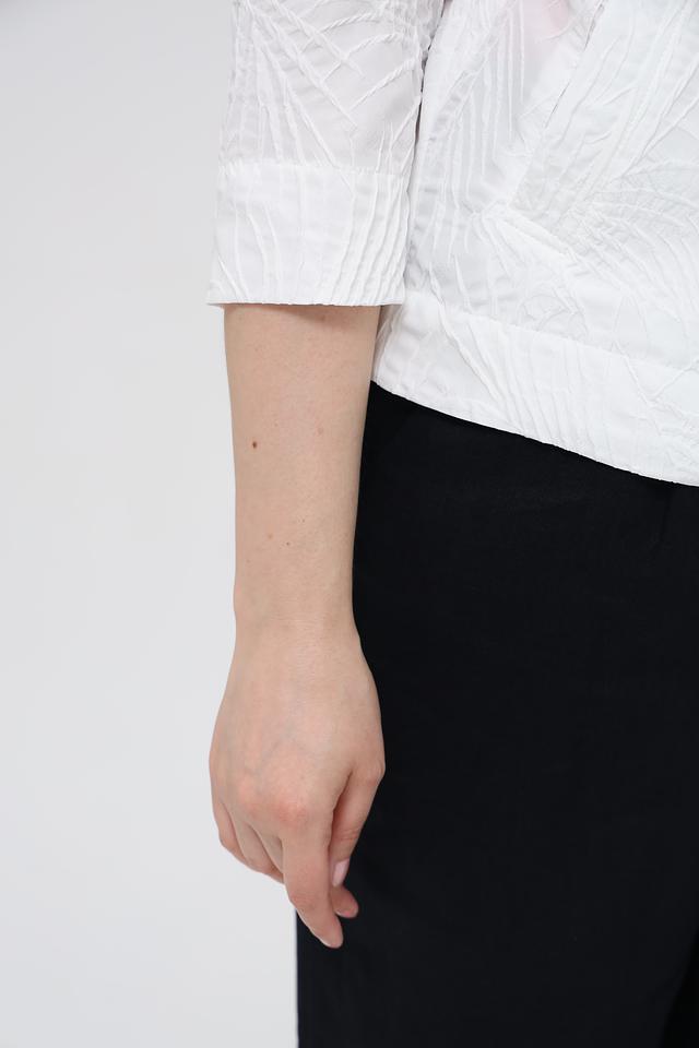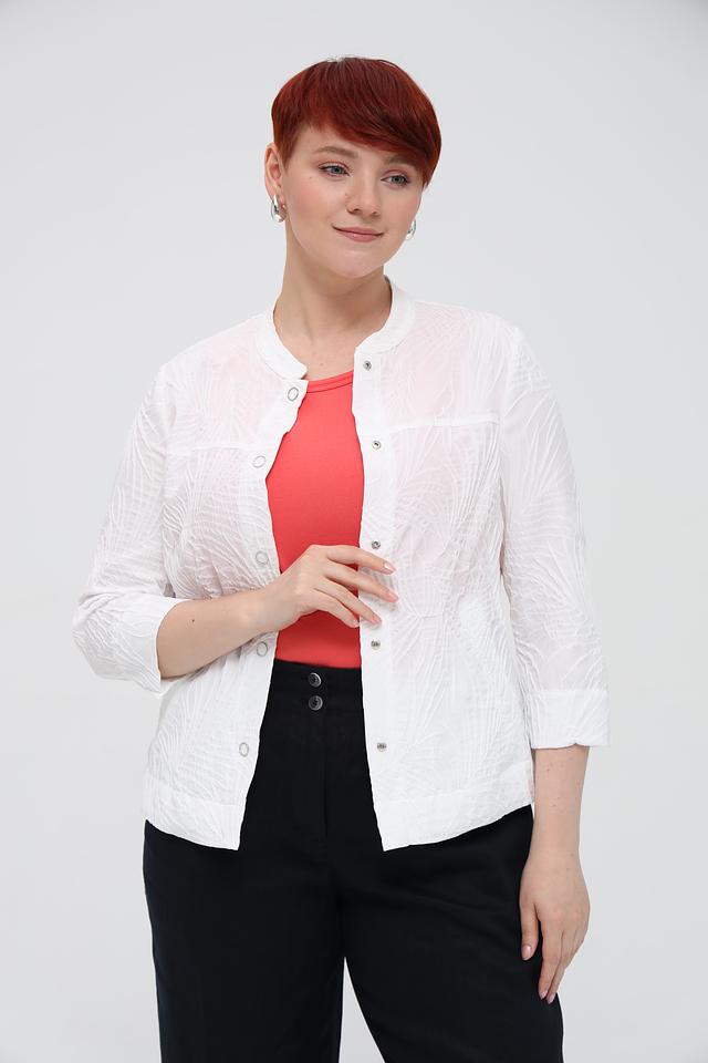 Модель имеет классический крой с ¾ рукавами и застежкой на пуговицы. Жакет хорошо сочетается с различными предметами гардероба, такими как брюки, юбки и платья.